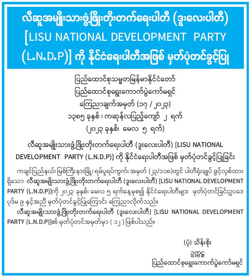 လီဆူအမျိုးသားဖွံ့ဖြိုးတိုးတက်ရေးပါတီ (ဒူးလေးပါတီ) [LISU NATIONAL DEVELOPMENT PARTY (L.N.D.P)] ကို နိုင်ငံရေးပါတီအဖြစ် မှတ်ပုံတင်ခွင့်ပြု
