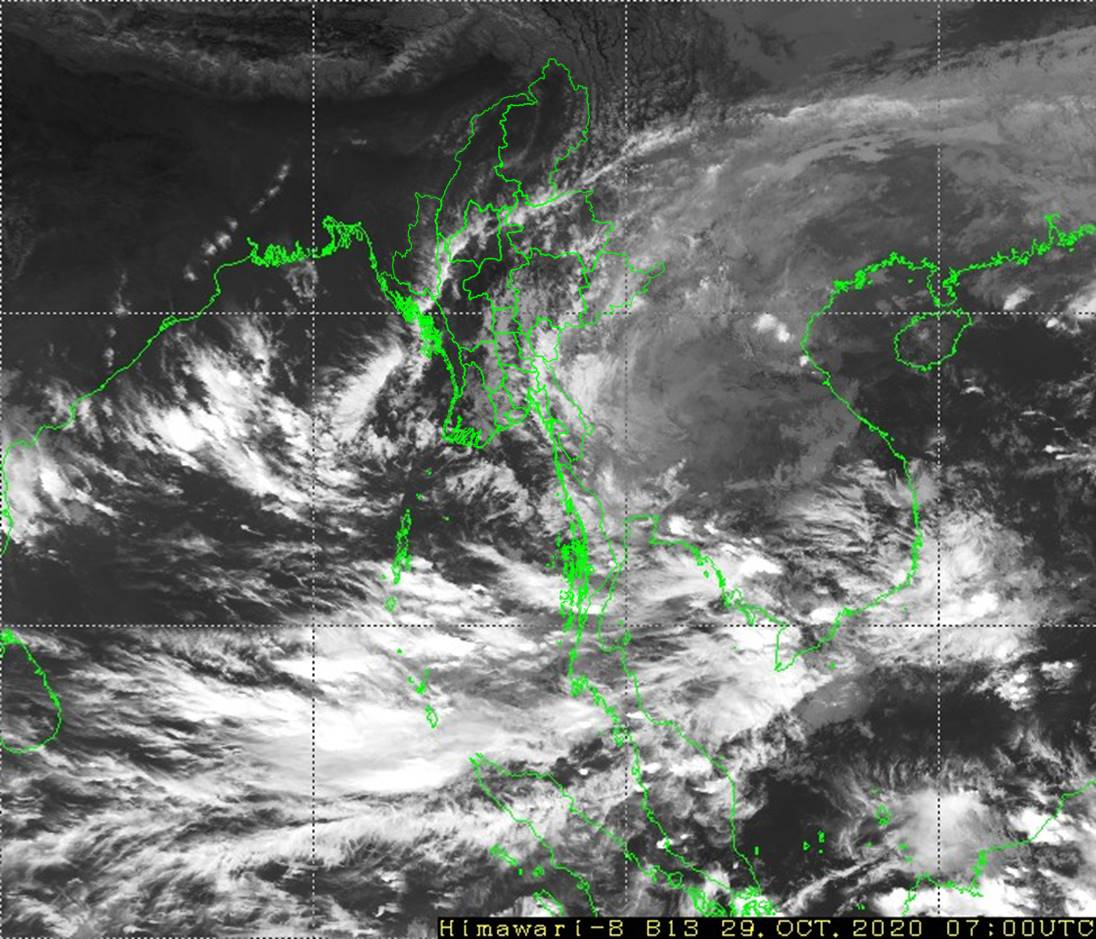 ဘင်္ဂလားပင်လယ်အော်အ‌ခြေအနေ။ ကပ္ပလီပင်လယ်ပြင်နှင့် ဘင်္ဂလားပင်လယ်အော်အရှေ့တောင်ပိုင်းတို့တွင် တိမ်အသင့်အတင့်မှ တိမ်ထူထပ်နေပြီး၊ ကျန်ဘင်္ဂလားပင်လယ်အော်တွင် တိမ်အနည်းငယ်မှ တိမ်အသင့်အတင့် ဖြစ်ထွန်းနေပါသည်။