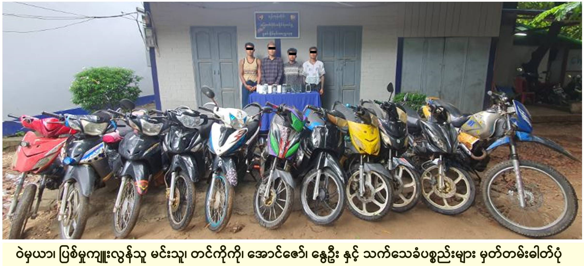 ရန်ကုန်တိုင်းဒေသကြီးရဲတပ်ဖွဲ့မှူး၏ လမ်းညွှန်ချက်နှင့်အညီ မြောက်ပိုင်းခရိုင်ရဲတပ်ဖွဲ့မှူးက အနီးကပ်ကြီးကြပ်၍ ခရိုင်မှုခင်းနှိမ်နင်းရေးဌာနစုမှ တပ်ဖွဲ့ဝင်များနှင့် လှိုင်သာယာ(အရှေ့ပိုင်း)မြို့နယ် ရဲတပ်ဖွဲ့မှတပ်ဖွဲ့ဝင်များသည် ဇူလိုင် ၂ ရက်နေ့ က လှိုင်သာယာ(အရှေ့ပိုင်း)မြို့နယ်အတွင်း ခိုး၊ဆိုး၊လု၊နှိုက် သတင်းများ စုံစမ်းဆောင်ရွက်နေစဉ် ခိုးမှု/လုယက်မှုများကျူးလွန်ထားကြောင်း ကြိုတင် သတင်းရရှိထားသူ မင်းသူ(ခ)ကရင်၊ တင်ကိုကို(ခ)နေလင်း နှင့် နွေဦး တို့(၃)ဦးကို KENBO-125 အမျိုး အစား ဆိုင်ကယ်(၁)စီးနှင့်အတူ တွေ့ရှိစစ်ဆေးရာ အဆိုပါဆိုင်ကယ်အား ဇွန်လပိုင်းက လှိုင်သာယာ(အရှေ့ပိုင်း)မြို့နယ်၊ မီးခွက်ဈေးအောက်ထိပ် ကားမှတ်တိုင်အနီးမှ ခိုးယူလာခဲ့ ခြင်းဖြစ်ကြောင်း စစ်ဆေးပေါ်ပေါက်သဖြင့် ဖမ်းဆီးခဲ့သည်။