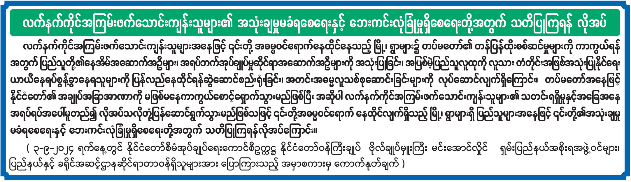 လက်နက်ကိုင်အကြမ်းဖက်သောင်းကျန်းသူများ၏ အသုံးချမှုမခံရစေရေးနှင့် ဘေးကင်းလုံခြုံမှုရှိစေရေးတို့အတွက် သတိပြုကြရန် လိုအပ်
