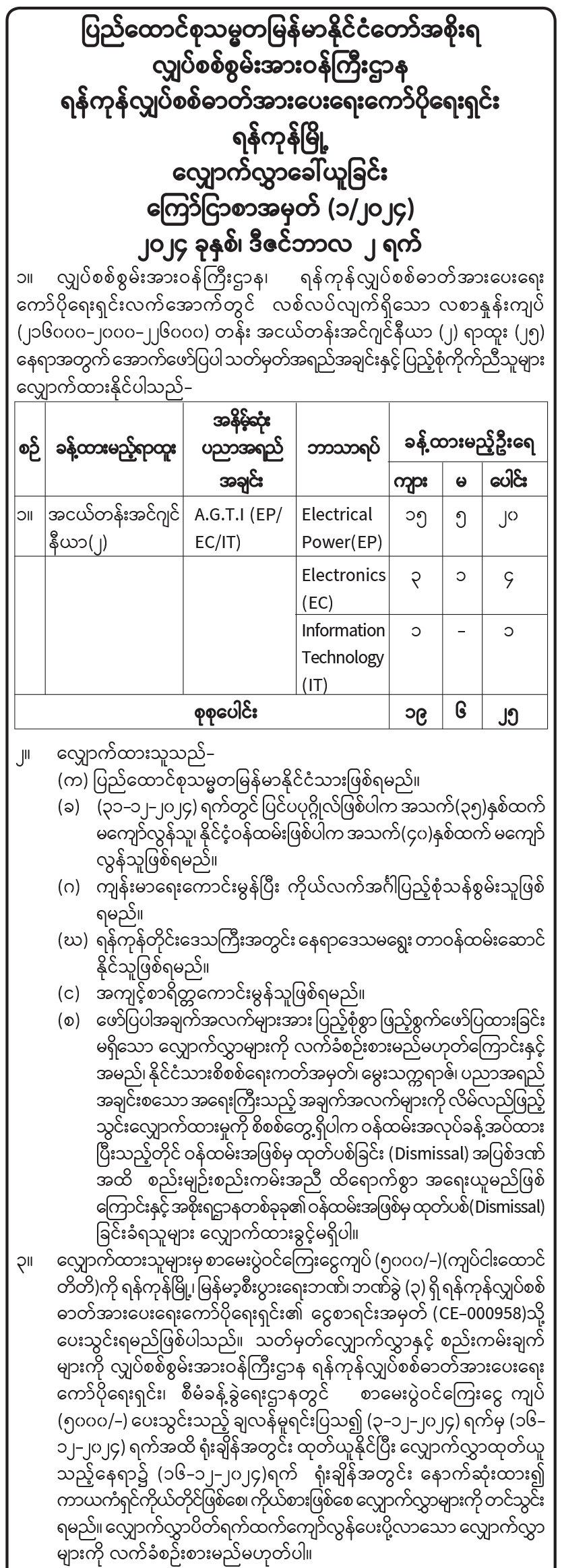 လျှပ်စစ်စွမ်းအားဝန်ကြီးဌာန၊ ရန်ကုန်လျှပ်စစ်ဓာတ်အားပေးရေး ကော်ပိုရေးရှင်းလက်အောက်တွင် လစ်လပ်လျက်ရှိသော လစာနှုန်းကျပ် (၂၁၆၀၀၀-၂၀၀၀-၂၂၆၀၀၀) တန်း အငယ်တန်းအင်ဂျင်နီယာ (၂) ရာထူး (၂၅) နေရာအတွက် သတ်မှတ်အရည်အချင်းနှင့် ပြည့်စုံကိုက်ညီသူများ လျှောက်ထားနိုင်