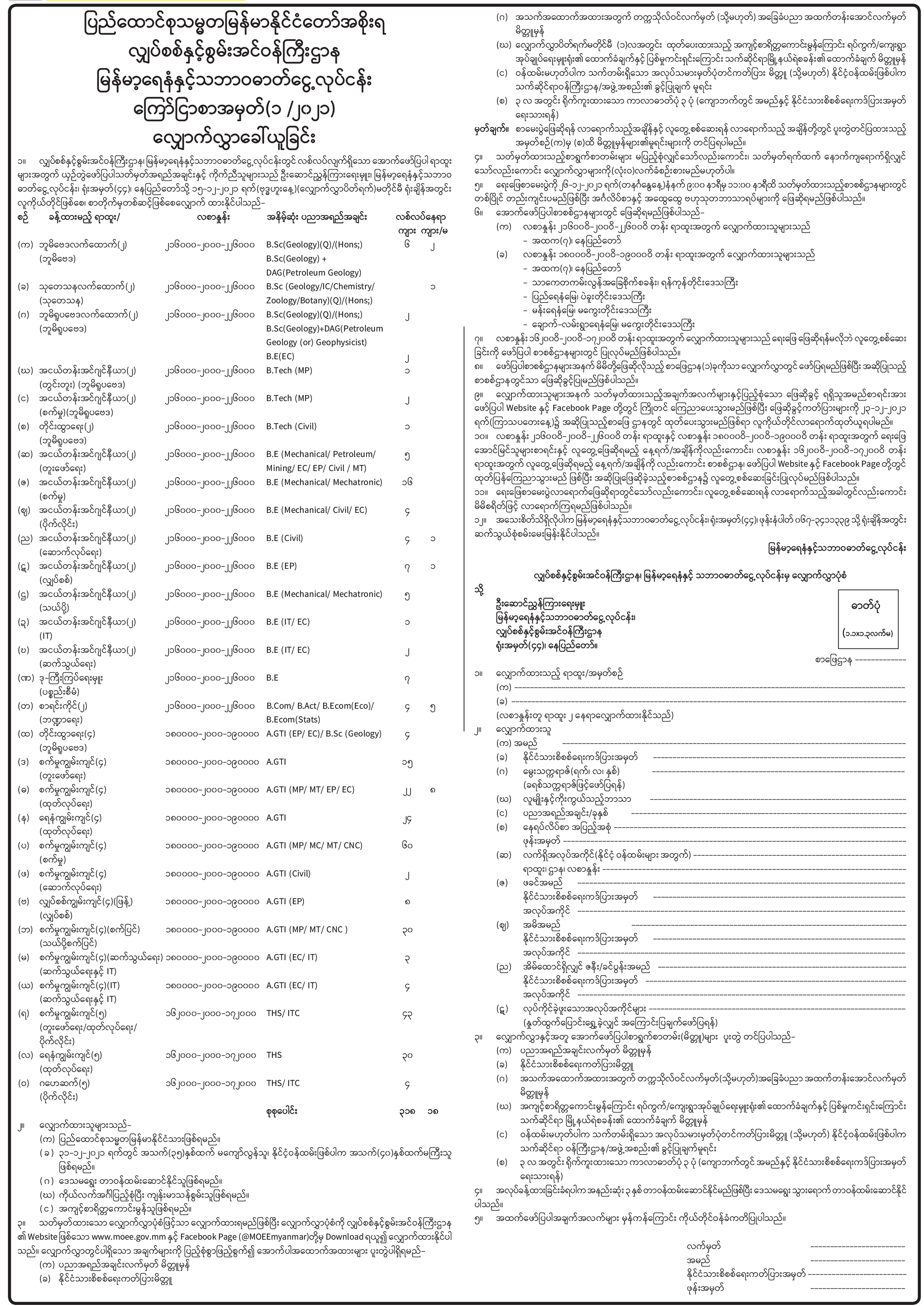 လျှပ်စစ်နှင့် စွမ်းအင်ဝန်ကြီးဌာန မြန်မာ့ရေနံနှင့် သဘာဝဓာတ်ငွေ့လုပ်ငန်းတွင် လစ်လပ်လျက်ရှိသော ရာထူးနေရာများအတွက် လျှောက်လွှာခေါ်ယူ