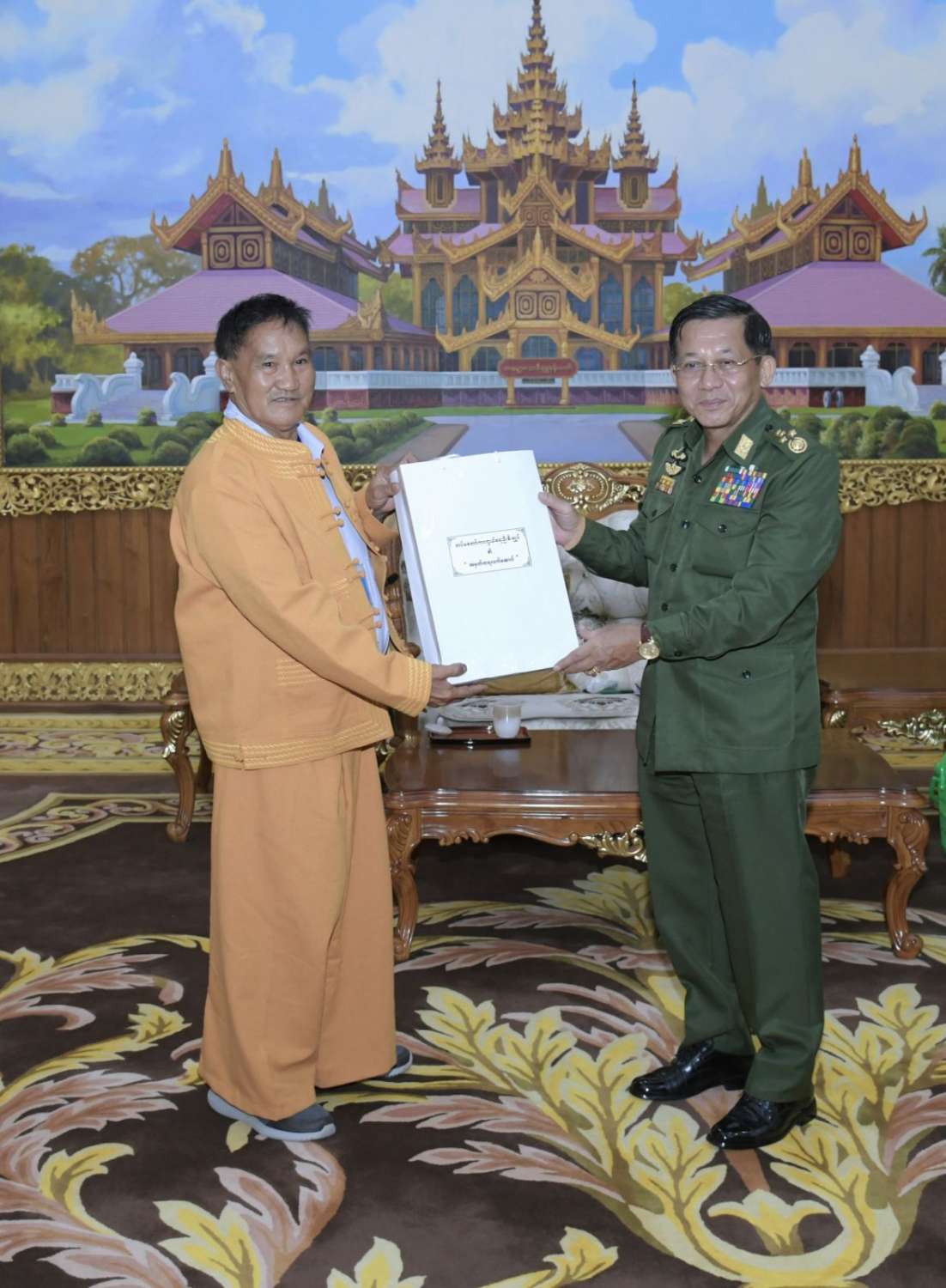 တွေ့ဆုံပွဲအပြီးတွင် နိုင်ငံတော်စီမံအုပ်ချုပ်ရေးကောင်စီဥက္ကဋ္ဌ တပ်မတော်ကာကွယ်ရေးဦးစီးချုပ်က ရှမ်းပြည်တိုးတက်ရေးပါတီ(SSPP)မှ ဒုတိယဥက္ကဋ္ဌ (၁)နှင့် အဖွဲ့ဝင်များအား အမှတ်တရလက်ဆောင်ပစ္စည်းများပေးအပ်ရာ ရှမ်းပြည်တိုးတက်ရေးပါတီ(SSPP)မှ ဒုတိယဥက္ကဋ္ဌ(၁)မှ ဒေသထွက်လက်ဆောင်ပစ္စည်းများကို ပြန်လည်ပေးအပ်ခဲ့ပြီး အမှတ်တရစုပေါင်းဓာတ်ပုံရိုက်ကြသည်။