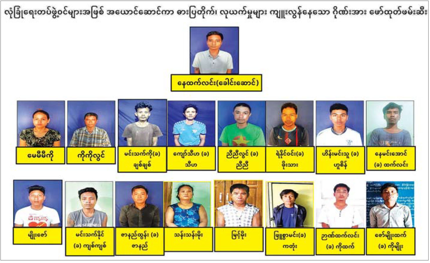 ဖမ်းဆီးရမိတရားခံ နေထက်လင်း၏ ထွက်ဆိုချက်အရ ကွင်းဆက်တရားခံများ ဖမ်းဆီးရမိရေး ဆက်လက်ဖော်ထုတ် ဖမ်းဆီးခဲ့ရာ ဓားပြတိုက်၊ လုယက်မှုများတွင် ပူးပေါင်းပါဝင်ခဲ့သူများ ဖြစ်သည့် ၎င်း၏ဇနီး မေမီမီကို (၃၁) နှစ် (ဘ) ဦးကိုကိုလွင်၊ စဉ့်ကိုင်မြို့နယ် အရေးမဆိုကျေးရွာနေ ညီညီလွင် (ခ) ညီညီ (၂၉) နှစ် (ဘ) ဦးအေးကို၊ ချမ်းမြသာစည်မြို့နယ် မြရည်နန္ဒာ ရပ်ကွက်နေ ကိုကိုလွင် (၆၅) နှစ် (ဘ) ဦးတင်မောင်လေး၊ အမရပူရမြို့နယ်၊ ရေကြည်ပေါက်ကျေးရွာ နေသူများဖြစ်သည့် ရဲနိုင်ဝင်း (ခ) ဖိုးသား (၃၇) နှစ် (ဘ) ဦးခင်မောင်နှင့် ဟိန်းမင်းသူ (ခ) ဟူစိန် (၂၂) နှစ် (ဘ) ဦးမြင့်စိုး၊ မကွေးတိုင်းဒေသကြီး မင်းလှမြို့ အမှတ် (၁၀) ရပ်ကွက်နေ နေမင်းအောင် (ခ) ထက်လင်း (၂၆) နှစ် (ဘ) ဦးမြင့်မိုး၊ အမရပူရမြို့နယ် စာတိုးကျေးရွာနေ မျိုးဇော် (၂၆) နှစ် (ဘ) ဦးမြင့်နောင်၊ ချမ်းမြသာစည်မြို့နယ် အောင်ပင်လယ်ရပ်ကွက်နေသူများဖြစ်သည့် မင်းသက်နိုင် (ခ) ကျစ်ကျစ် (၂၈) နှစ် (ဘ) ဦးကိုကိုလွင်၊ ကျော်သီဟ (ခ) သီဟ (၂၄) နှစ် (ဘ) ဦးကျော်၊ မင်းသက်ကို (ခ) ချစ်ချစ် (၂၃) နှစ် (ဘ) ဦးကိုကိုလွင်၊ ပုသိမ်ကြီးမြို့နယ် ကုလားကြီးကျေးရွာနေ ဇာနည်ထွန်း (ခ) ဇာနည် (၃၈) နှစ် (ဘ) ဦးကြည်လေး၊ နေပြည်တော် သာဝတ္ထိမြို့ စက်ရုံစုရပ်ကွက်နေ ဉာဏ်ထက်လင်း (ခ) ကိုထက် (၃၁) နှစ် (ဘ) ဦးနေမျိုးလှိုင်၊ မုံရွာမြို့ မြဝတီရပ်ကွက်နေသူများဖြစ်သည့် သန်းသန်းမိုး (၅၁) နှစ် (ဘ) ဦးသံချောင်းနှင့် မြင့်မိုး (၅၁) နှစ် (ဘ) ဦးပေါရှိန်၊ အမရပူရမြို့နယ် ဘနောကျေးရွာနေ ဖြူစွာမင်း (ခ) ကတုံး (၃၀) နှစ် (ဘ) ဦးချွတ်၊ ဟုမ္မလင်းမြို့နေ ဇော်မျိုးထက် (ခ) ကိုမျိုး (၃၃) နှစ် (ဘ) ဦးသံချောင်း တို့ပါဝင်သော ဂိုဏ်းအဖွဲ့မှ တရားခံအမျိုးသား ၁၅ ဦး၊ အမျိုးသမီးနှစ်ဦး စုစုပေါင်း ၁၇ ဦးတို့အား ပြစ်မှုကျူးလွန်ရာတွင် အသုံးပြုသည့် ပစ္စတိုသေနတ် လေးလက်၊ မော်တော်ယာဉ်သုံးစီး၊ ဆိုင်ကယ် တစ်စီး၊ ပြောက်ကျားဝတ်စုံ လေးစုံတို့နှင့်အတူ ထပ်မံဖော်ထုတ် ဖမ်းဆီးရမိခဲ့သည်။