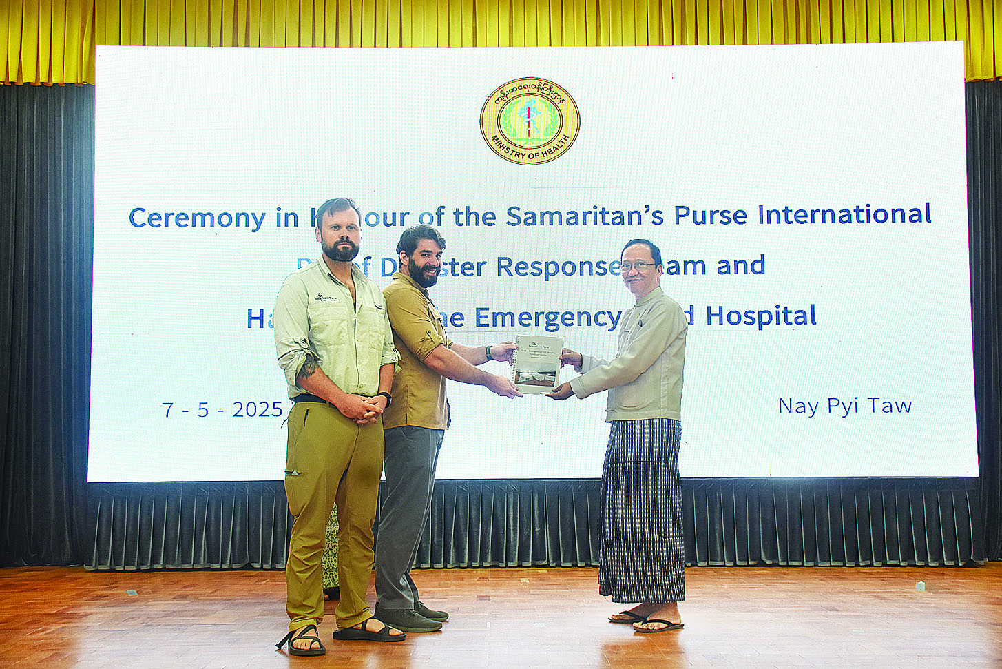 ကျန်းမာရေးဝန်ကြီးဌာန ပြည်ထောင်စုဝန်ကြီး ဒေါက်တာသက်ခိုင်ဝင်းသည် ယနေ့တွင် အမျိုးသား သဘာဝ ဘေးအန္တရာယ်စီမံခန့်ခွဲမှုကော်မတီဥက္ကဋ္ဌ၏ ကိုယ်စား အရေးပေါ်ကျန်းမာရေးစောင့်ရှောက်မှု လုပ်ငန်းများပြီးဆုံး၍ ပြန်လည်ထွက်ခွာမည့် အမေရိကန်အခြေစိုက် Samaritan’s Purse International Relief ဆေးအဖွဲ့အား ဂုဏ်ပြုနှုတ်ဆက်ပွဲနှင့် အရေးပေါ်ဆေးရုံ၊ ဆေးနှင့် ဆေးပစ္စည်းများ လှူဒါန်းပွဲအခမ်းအနားသို့ တက်ရောက်သည်။