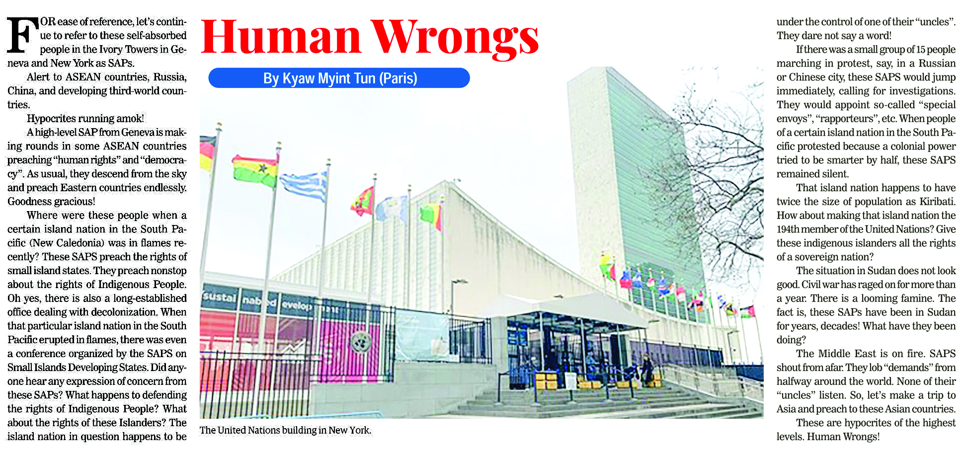 မကြာသေးမီက တောင်ပစိဖိတ်သမုဒ္ဒရာ ကျွန်းနိုင်ငံလေးဖြစ်တဲ့ နယူးကာလီဒိုးနီးယားမှာ ဆန္ဒပြအဓိကရုဏ်းတွေနဲ့ ဟုန်းဟုန်းတောက်လောင် နေချိန်မှာ အဲဒီပုဂ္ဂိုလ်တွေ ဘယ်ရောက်နေကြပါလိမ့်။ အဲဒီကိုယ်ကျိုးအတ္တကြီးသူတွေဟာ ကျွန်းနိုင်ငံလေးတွေရဲ့ ရပိုင်ခွင့်တွေကို စည်းရုံးဟောပြောလေ့ရှိကြတယ်။ ဌာနေတိုင်းရင်းသားတွေရဲ့ အခွင့်အရေးတွေ နဲ့ စပ်လျဉ်းပြီးတော့လည်း မနားမနေထောက်ခံပြောဆိုကြတယ်။ ဟုတ်ပါရဲ့… ကိုလိုနီနယ်မြေ အဖြစ်မှ အဆုံးသတ်ရေး ကိစ္စတွေကိုလုပ်ဖို့ ဝါရင့်ရုံးတော်ကြီးတစ်ရုံးတောင် ရှိနေပါသေးတယ်။