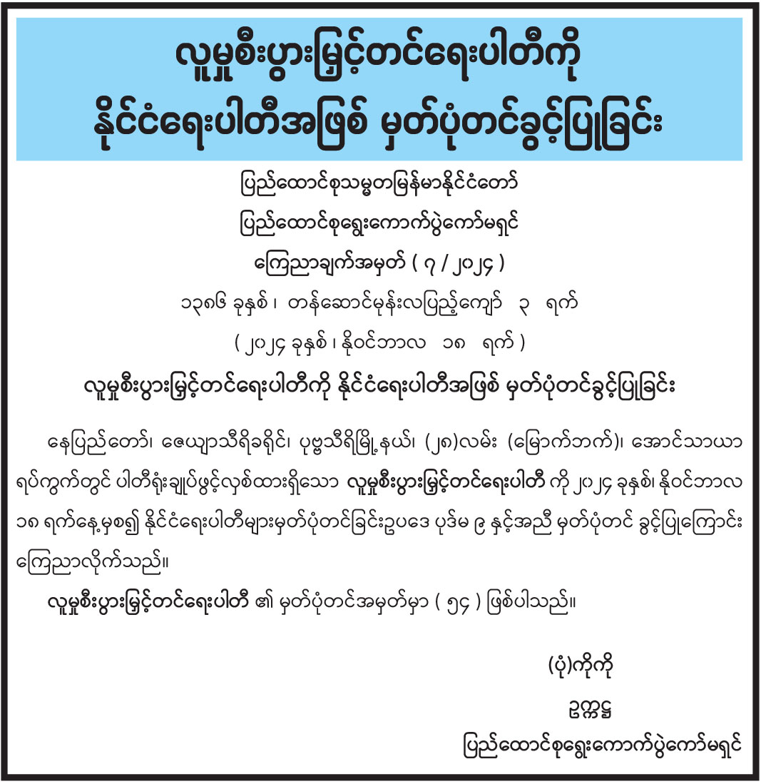 လူမှုစီးပွားမြှင့်တင်ရေးပါတီကို နိုင်ငံရေးပါတီအဖြစ် မှတ်ပုံတင်ခွင့်ပြုခြင်း