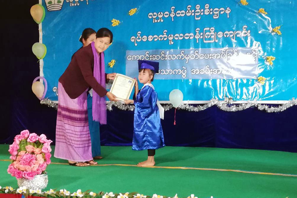 အခမ်းအနားကို မူလတန်းကြိုကျောင်း(ရပ်စောက်)မှ ကျောင်းသားကျောင်းသူလေးများ အဖွင့်သီးချင်း သီဆိုဖွင့်လှစ်ခဲ့ပြီး ကျောင်းအုပ် ဒေါ်ကြွယ်ကြွယ်သိန်းက နှုတ်ခွန်းဆက်စကား ပြောကြားသည်။ ပြီးနောက် ကျောင်းဆင်းလက်မှတ်များအား ကျောင်းသားကျောင်းသူ တစ်ဦးချင်းစီ၏ လက်ဝယ်သို့ အခမ်းအနား တက်ရောက်လာသည့် ဧည့်သည်တော်များက ပေးအပ်ခဲ့ကြပြီး မူလတန်းကြိုကျောင်း(ရပ်စောက်) ကျောင်းသားကျောင်းသူလေးများက အကပဒေသာများဖြင့် ဖျော်ဖြေတင်ဆက်ခဲ့ကြောင်း သိရသည်။