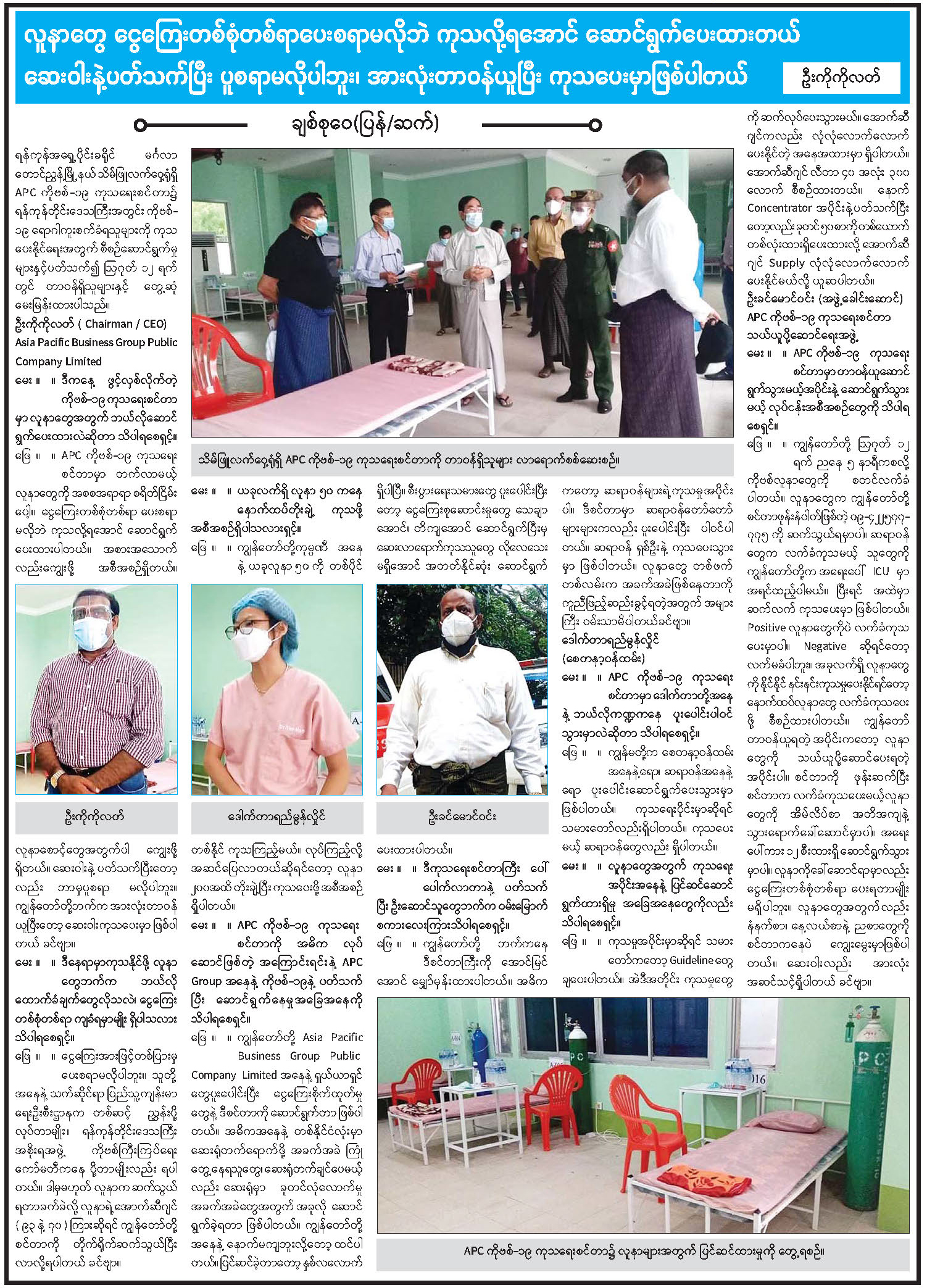 လူနာတွေ ငွေကြေးတစ်စုံတစ်ရာပေးစရာမလိုဘဲ ကုသလို့ရအောင် ဆောင်ရွက်ပေးထားတယ်၊ ဆေးဝါးနဲ့ပတ်သက်ပြီး ပူစရာမလိုပါဘူး၊ အားလုံးတာဝန်ယူပြီး ကုသပေးမှာဖြစ်ပါတယ်