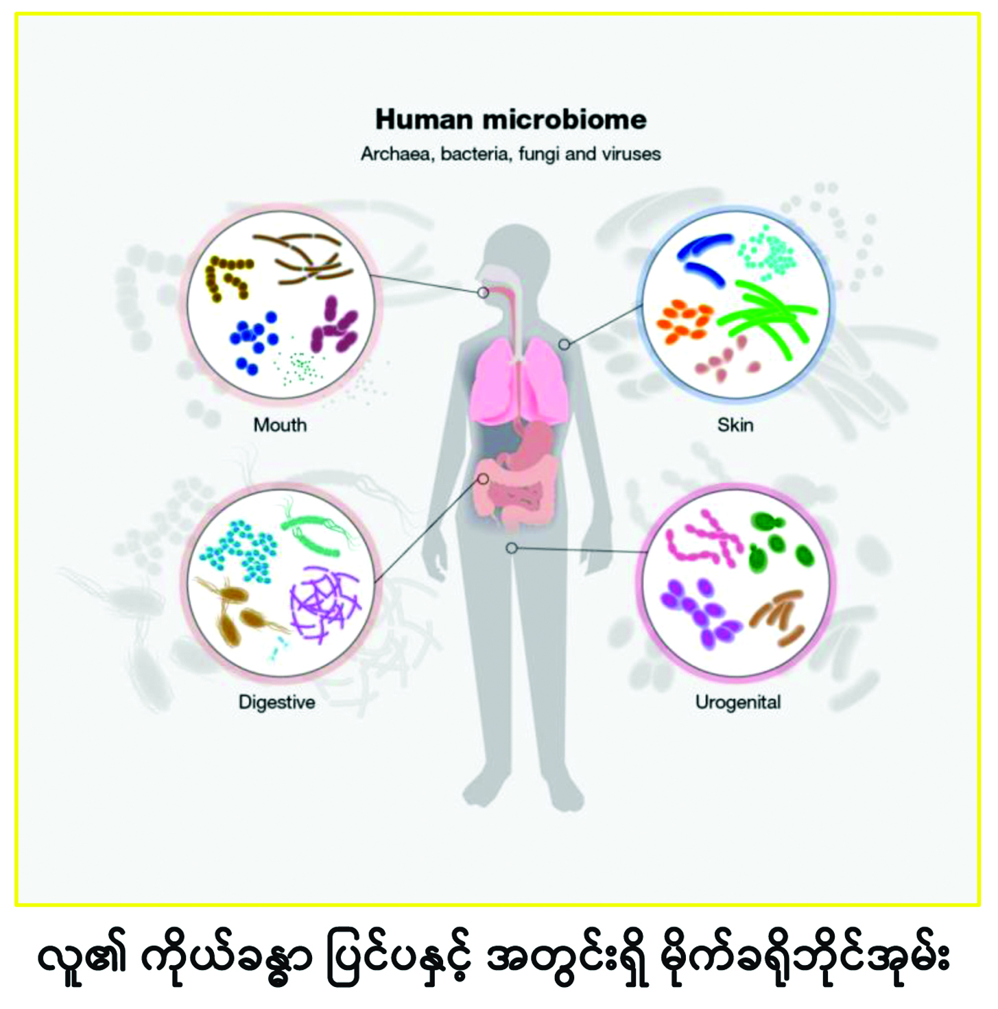 အဏုဇီဝပိုး ထရီလီယံ(တစ်ဂဏန်း နောက်တွင် သုည ၁၂ လုံးပါသောအရေအတွက်) ပေါင်းများစွာသည် အဓိကအားဖြင့် အူလမ်းကြောင်းတွင်းနှင့် အရေပြားပေါ်၌နေထိုင်ကြပါသည်။ လူတိုင်း၏ ခန္ဓာကိုယ်တွင် အတူတကွမှီတင်းနေထိုင်ကြသည့် အဏုဇီဝဆဲလ်ပေါင်း ၁၀ ထရီလီယံမှ ၁၀၀ ထရီလီယံအထိ ရှိကြပါသည်။ လူသားများနှင့် ၎င်းပိုးများသည် နှစ်ပေါင်းသန်းနှင့်ချီ၍ အတူတကွ ဆင့်ကဲဖြစ်ပေါ်လာခဲ့ကြပြီး လူ့ခန္ဓာကိုယ်၏ အလွန်အရေးကြီးသည့် အခန်းကဏ္ဍ များတွင်ပါဝင်ခဲ့ကြပါသည်။ အကယ်၍ အူတွင်းအဏုဇီဝပိုးများ (Gut Micro- biome)၏ ပူးပေါင်းဆောင်ရွက်မှုသာ မပါရှိလျှင် သတ္တဝါများ အသက်ရှင်ရန်ပင် အလွန်ခက်ခဲမည်ဖြစ်ပါသည်။