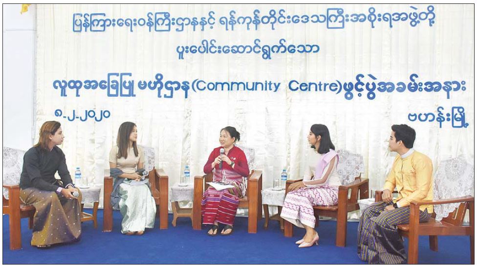 ဦးဆောင်ဆွေးနွေးသူ။ ။ နိုင်ငံတစ်ဝန်းမှာ ပြန်ကြားရေးဝန်ကြီးဌာနနဲ့ ဒေါ်ခင်ကြည်ဖောင်ဒေးရှင်းတို့ ပူးပေါင်းဆောင်ရွက်တဲ့ Community Centre ၁၆ ခု ရှိပါတယ်။ လွန်ခဲ့တဲ့ ၁၉၆၀ ခုနှစ်လောက်ကတည်းက စပြီးတော့ Community Centre ကို ကျွန်မတို့ အိမ်နီးချင်းနိုင်ငံတွေမှာ လုပ်ဆောင်ခဲ့ တာဖြစ်ပါတယ်။ ကျွန်မတို့နိုင်ငံရဲ့ လိုအပ် ချက်ကို ပြည်သူတွေလည်း သိလောက်မယ်လို့ထင်ပါတယ်။ Community Centre ဟာ ကျွန်မတို့ ပြည်သူတွေအတွက် ဘယ်လောက်အထိ အရေအတွက်များများ လိုအပ်နေတယ်ဆိုတဲ့ ကဏ္ဍလေးက ရှိလာတာပေါ့။ ဒါက ကျွန်မတို့ နိုင်ငံတော်ရဲ့လိုအပ်ချက်။ အမေရိကန်နဲ့ အင်္ဂလန်တို့မှာ အခြေပြုပြီးတော့ Community Centre ဆိုတာ ပေါ်ပေါက်လာတာ။ အာရှနိုင်ငံတွေထဲမှာဆိုရင် စင်ကာပူကတော့ ဥပမာပြလို့ အကောင်းဆုံး နိုင်ငံတစ်ခုထဲမှာ ပါပါတယ်။ ၁၉၆၀ မှာ စင်ကာပူမှာ စလုပ်ခဲ့တယ်။ ကျွန်မတို့ဆီမှာလည်း ပြန်ကြားရေးဝန်ကြီးဌာနက ဦးဆောင်ပြီးတော့ စလုပ်နေပါပြီ။ ကျွန်မတို့ အစိုးရလက်ထက်မှာ ဒါက Nation Building တစ်ခုပဲ ဖြစ်ပါတယ်။ ဒီ community Centre ထဲမှာ ပါဝင်တာတွေနဲ့ပတ်သက်ပြီး ပြည်သူတွေအတွက် ဘာတွေအကျိုးရှိမလဲဆိုတာ မောင်လေးငြိမ်းချမ်းကိုကိုက လူငယ်တစ်ယောက်အနေနဲ့ ပြည်သူတွေကို ပြောပြပေးစေချင်ပါတယ်။