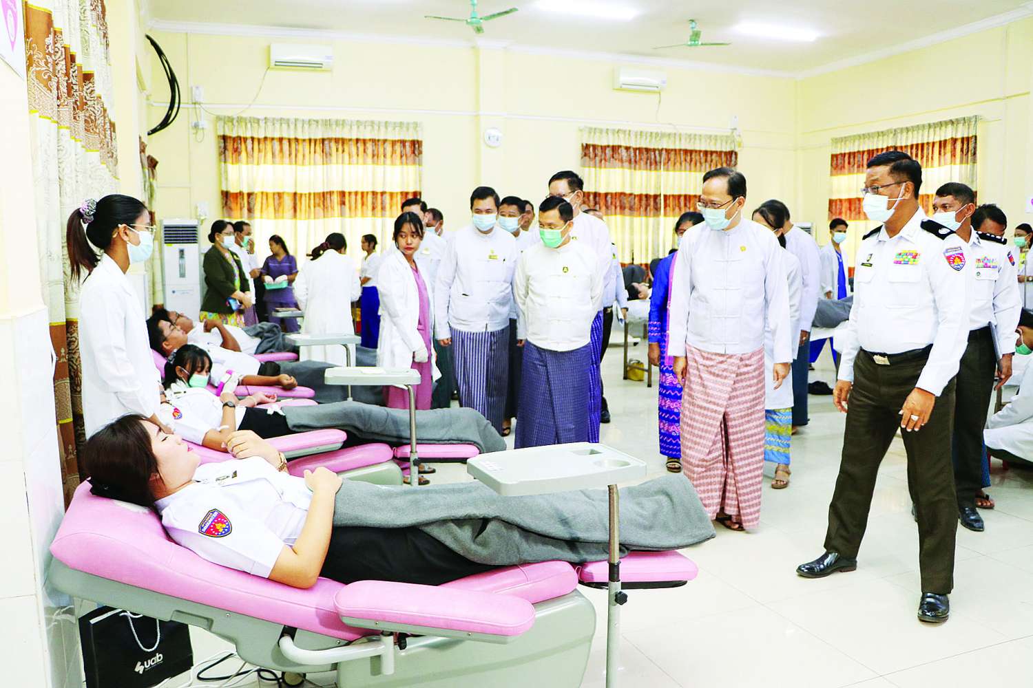 ထို့နောက် ပြည်ထောင်စုဝန်ကြီးများသည် ခန်းမအတွင်း၌ သွေးလှူဒါန်းနိုင်ရေး စစ်ဆေးပြီးစီးသည့် ဝန်ထမ်းများ စုပေါင်းသွေးလှူဒါန်းနေမှုကို လိုက်လံကြည့်ရှု အားပေးစကားပြောကြားကြပြီး သွေးအလှူရှင်ဝန်ထမ်းများအား အာဟာရဖြည့်စွက်စာများနှင့် ထောက်ပံ့ငွေများကို ချီးမြှင့်ပေးအပ် ကြသည်။