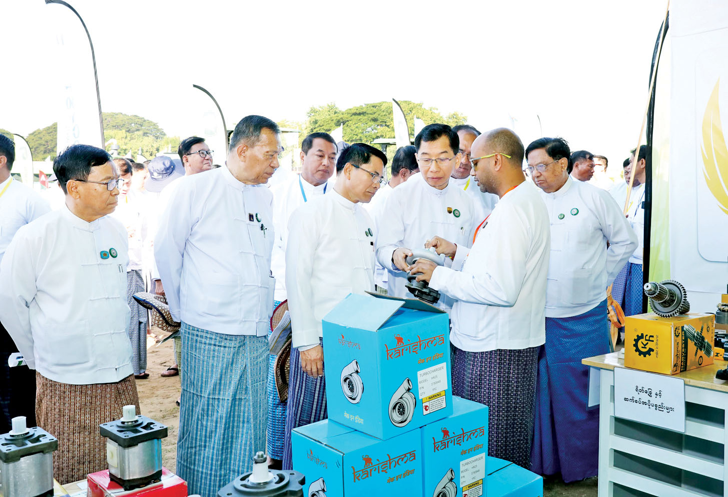 ဦးစွာ စိုက်ပျိုးရေး၊ မွေးမြူရေးနှင့်ဆည်မြောင်းဝန်ကြီးဌာန ပြည်ထောင်စုဝန်ကြီး ဦးမင်းနောင်၊ စက်မှုလယ်ယာဦးစီးဌာန ညွှန်ကြားရေးမှူးချုပ် ဦးကျော်ထွန်းအေးနှင့် မြန်မာနိုင်ငံ လယ်ယာသုံးစက်ကိရိယာလုပ်ငန်းရှင်များအသင်းဥက္ကဋ္ဌ ဦးနိုင်ဦးတို့က လယ်ယာသုံးစက်ကိရိယာ ပြပွဲကို ဖဲကြိုးဖြတ်ဖွင့်လှစ်ပေးကြသည်။