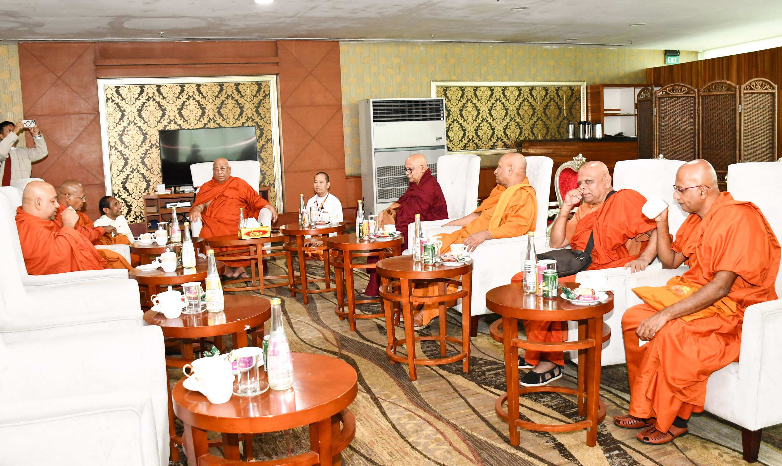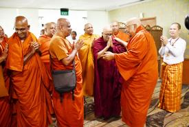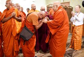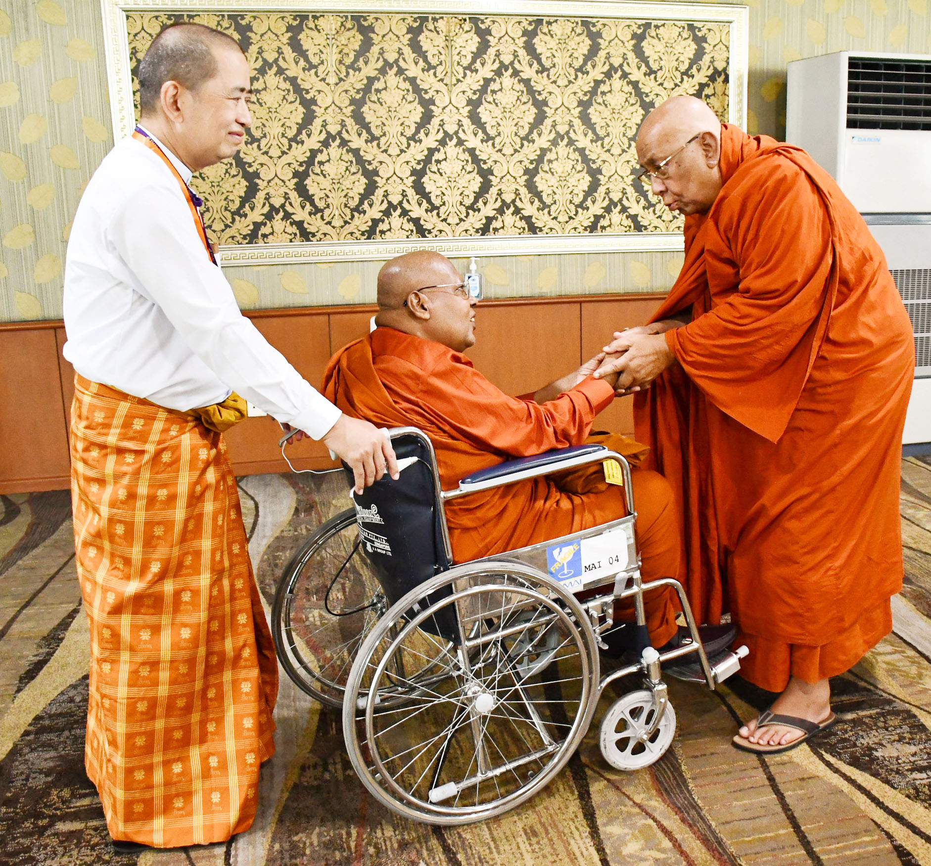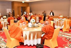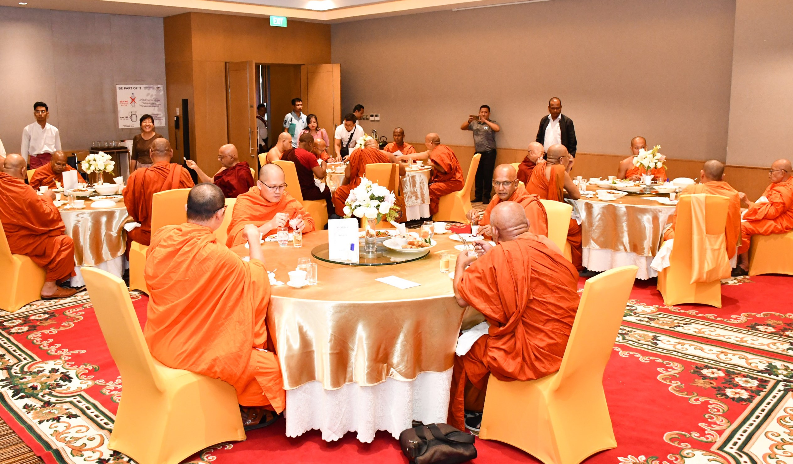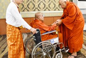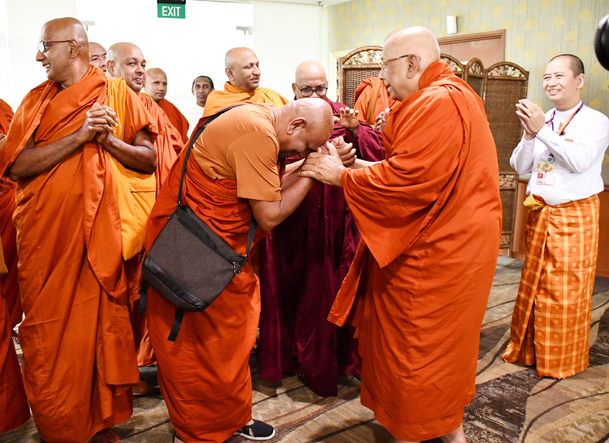 ပြည်ပမှကြွရောက်လာကြသည့် ဆရာတော်ကြီးများအား အဘိဓဇမဟာရဋ္ဌဂုရု ရွှေကျင်သာသနာပိုင် သီတဂူအဓိပတိ ဆရာတော်ဘုရားကြီး ဒေါက်တာအရှင်ဉာဏိဿရနှင့် တာဝန်ရှိသူများ၊ သာသနာတော် ထွန်းကားပြန့်ပွားရေးဦးစီးဌာနမှ တာဝန်ရှိသူများက ရန်ကုန်အပြည်ပြည်ဆိုင်ရာလေဆိပ်၌ ကြိုဆိုနှုတ်ဆက်ကြပြီး ဆရာတော်များအား နေ့ဆွမ်းဆက်ကပ်ခဲ့ကြောင်း သိရှိရသည်။