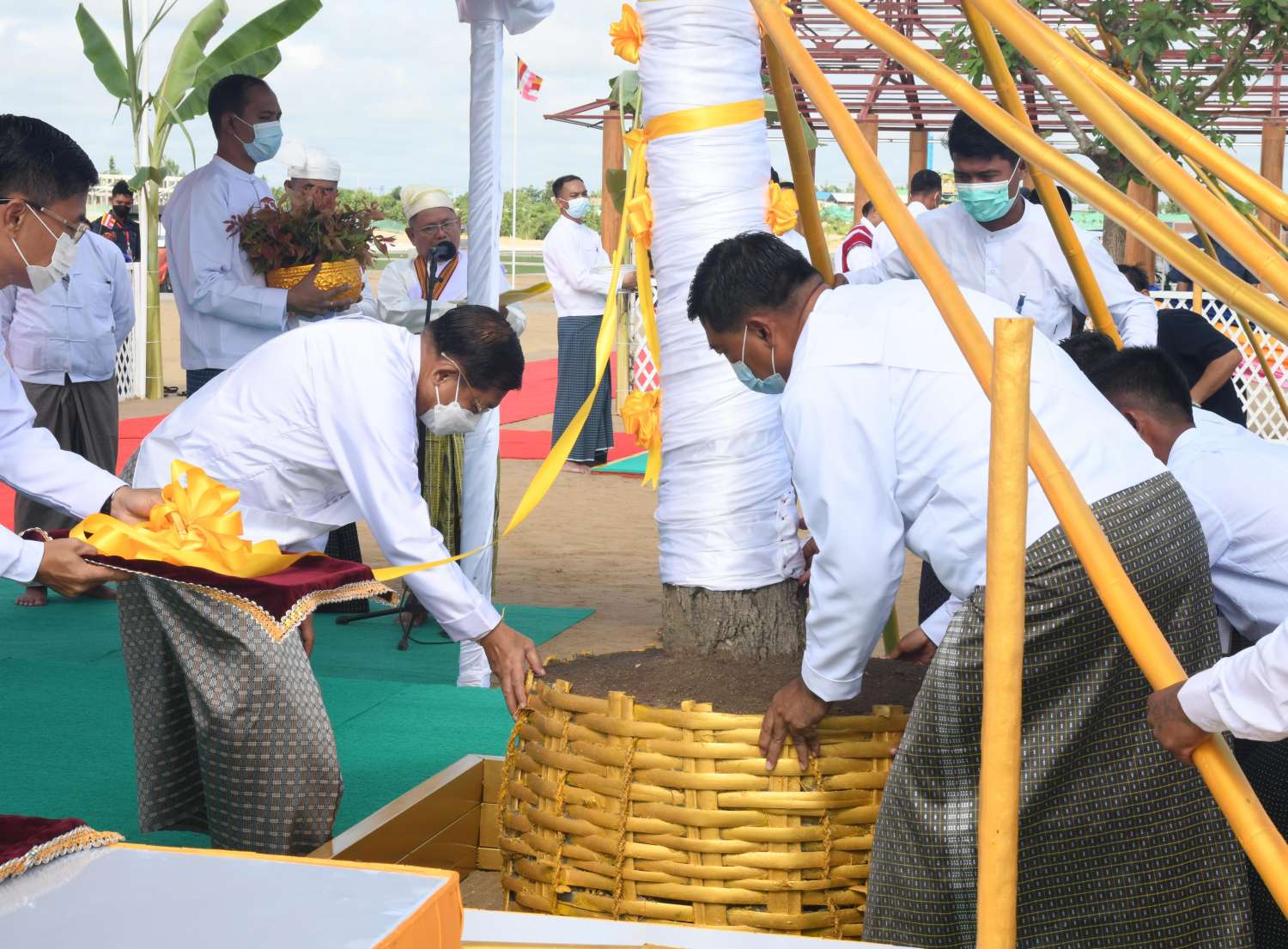 ယင်းနောက် အခမ်းအနားမှူးက အခါတော်စာတမ်းကိုဖတ်ကြားပြီး နိုင်ငံတော်စီမံအုပ်ချုပ်ရေးကောင်စီဥက္ကဋ္ဌ နိုင်ငံတော်ဝန်ကြီးချုပ်က အမှတ်(၁) ကျည်းပင်စိုက်ပျိုးမည့်နေရာတွင် ကျောက်မျက်ရတနာများ ထည့်သွင်းပူဇော်၍ မင်္ဂလာအချိန် ရောက်ရှိချိန်တွင် ကျည်းပင်ကို မင်္ဂလာဖဲကြိုးဆွဲ၍ စိုက်ပျိုးပူဇော်သည်။ ထို့နောက် နိုင်ငံတော်စီမံအုပ်ချုပ်ရေးကောင်စီဥက္ကဋ္ဌ နိုင်ငံတော်ဝန်ကြီးချုပ်နှင့် အဖွဲ့ဝင်များသည် အမှတ်(၁) ကျည်းပင်အား မြေဆီများကျွေးမွေးပြီး ရေစင်ရေသန့်များသွန်းလောင်းကာ အမွှေးနံ့သာရည်များ ပက်ဖျန်းပူဇော်ကြသည်။