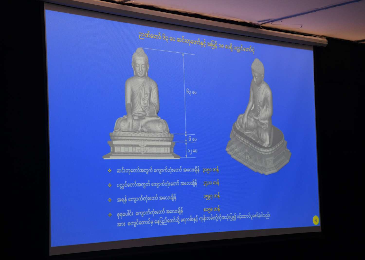 ထို့နောက် နိုင်ငံတော်စီမံအုပ်ချုပ်ရေးကောင်စီဥက္ကဋ္ဌ နိုင်ငံတော်ဝန်ကြီးချုပ်က ဗုဒ္ဓရုပ်ပွားတော်မြတ်ကြီး တည်ဆောက်ပူဇော်ရေး ဆောင်ရွက်ခဲ့သည်များနှင့် ပတ်သက်၍ ပြောကြားရာတွင် ကျောက်ဆစ်ဗုဒ္ဓရုပ်ပွားတော်မြတ်ကြီးအဖြစ် ထုဆစ်ပူဇော်မည့် စကျင်ကျောက်တော်ကြီးကို Shwe Foundation ၏ မေတ္တာရပ်ခံချက်အရ မိမိဦးဆောင်သည့် ခုနစ်ရက်သားသမီး ဘုရားဒါယကာ၊ ဒါယိကာမတို့က သီတဂူဆရာတော်ဘုရားကြီး၊ ရွှေသုဝဏ်ဆရာတော်ဘုရားကြီးနှင့် ပါမောက္ခချုပ် ဆရာတော်ဘုရားကြီးတို့၏ ဩဝါဒများနှင့်အညီ ခေတ်မီနည်းစနစ်များဖြင့် ထုဆစ်ပူဇော်နိုင်ရန် ဆောင်ရွက်ခဲ့ခြင်းဖြစ်ကြောင်း၊ ၂၀၁၈ ခုနှစ်တွင် လေ့လာရေးလုပ်ငန်းများကို စတင်ဆောင်ရွက်ခဲ့ပြီး စကျင်ကျောက်တော်ကြီးမှ ထွက်ရှိလာနိုင်သည့် အတိုင်းအတာ၊ ထုထည်နှင့် အပြစ်အနာအဆာရှိမှုအခြေအနေများကို သိရှိနိုင်ရန် ကျောက်တော်ကြီးအား တူးဖော်၍ X-Ray ရိုက် စမ်းသပ်စစ်ဆေးခဲ့ကြောင်း၊ ထွက်ပေါ်လာသည့်ကျောက်တော်ကြီးကို အကြမ်းထည်ပုံဖော်ကြည့်ရှုရာတွင် ဉာဏ်တော် ၆၅ ပေ ထွက်ရှိနိုင်သည်ကို တွက်ချက်ရရှိကာ ပလ္လင်တော် ၁၈ ပေ ထပ်မံထည့်သွင်းနိုင်ရေး လုပ်ဆောင်ခဲ့ကြောင်း၊ သီတဂူဆရာတော်ဘုရားကြီး၊ ရွှေသုဝဏ်ဆရာတော်ဘုရားကြီး၊ ပါမောက္ခချုပ်ဆရာတော် ဘုရားကြီးနှင့် ပါဠိတက္ကသိုလ်ကျောင်းတိုက် ဆရာတော်ကြီးတို့ထံမှလည်း ဩဝါဒနာယူ၍ ဆောင်ရွက်ခဲ့ကြောင်း။