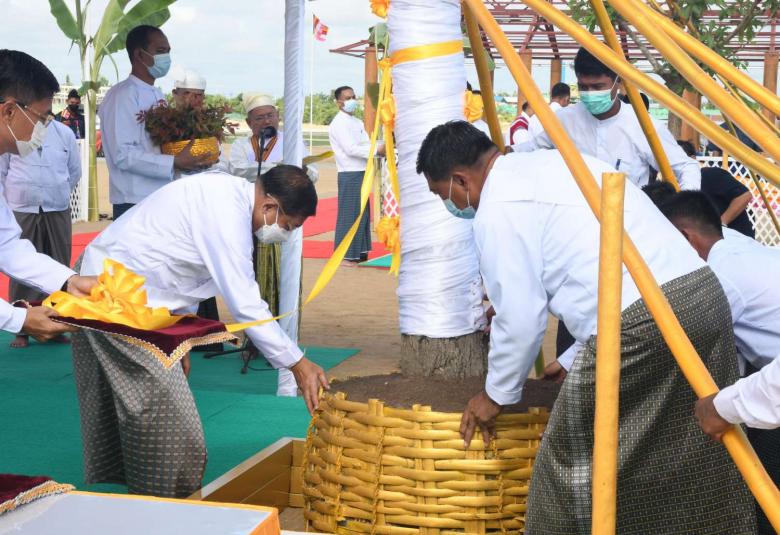 ဆဋ္ဌသင်္ဂါယနာတင်ပွဲအခမ်းအနား ပြုလုပ်ခဲ့သည့် ရန်ကုန်တိုင်းဒေသကြီး၊ သီရိမင်္ဂလာကမ္ဘာအေးကုန်းမြေရှိ ဆဋ္ဌသင်္ဂါယနာတင် မဟာပါသာဏ လိုဏ်ဂူသိမ်တော်ကြီး ကဲ့သို့သော သာသနာရေးဆိုင်ရာ အခမ်းအနားကြီးများ ကျင်းပပြုလုပ်နိုင်သည့် သာသနာ့ ဗိမာန်တော်ကြီးတစ်ခုကိုလည်း ထည့်သွင်းတည်ဆောက်လျက်ရှိပြီး သံဃာအပါး ၁၂၀၀ နှင့် လူပရိတ်သတ်များ ဝင်ဆံ့နိုင်မည်ဖြစ်ကြောင်း၊ မုစလိန္ဒအိုင်ကိုလည်း ဆရာတော်ကြီးများ၏ ဩဝါဒများနှင့်အညီ တည်ဆောက်နေကြောင်း၊ မိမိတို့ နိုင်ငံတော်စီမံအုပ်ချုပ်ရေးကောင်စီ တာဝန်ယူဆောင်ရွက်နေချိန်အတွင်း ဘုရားကြီးတည်ထားကိုးကွယ်မှုကို ပြီးစီးအောင်ရည်မှန်းဆောင်ရွက်နေကြောင်း၊ ဘုရားကြီးတည်ထားကိုးကွယ်မှု အောင်မြင်စွာပြီးစီးရေးအတွက် ကျွမ်းကျင်အင်ဂျင်နီယာများ၊ ခေတ်မီစက်ကိရိယာများဖြင့် နေ့ညမပြတ် ကြိုးပမ်းဆောင်ရွက်လျက်ရှိပြီး ယခုနှစ်ကုန်ပိုင်းတွင် အကြမ်းထည်ပြီးစီးမည်ဟု ခန့်မှန်းထားကြောင်း၊ ဗုဒ္ဓဥယျာဉ်တော်ကြီး တည်ဆောက်ပြီးစီးချိန်တွင် ဂေါပကဆရာတော်ကြီးများ သီတင်းသုံးနေထိုင်နိုင်ရေး ကျောင်းဆောင်တော်များကိုလည်း ထည့်သွင်းတည်ဆောက်သွားမည်ဖြစ်ကြောင်း၊ ထို့ပြင် ပိဋကတ် သုံးပုံကျမ်းစာအုပ်များ နိုင်ငံတကာကျမ်းစာများကဲ့သို့ အဆင့်မီ ပုံနှိပ်ဖြန့်ချိထုတ်ဝေနိုင်ရေးအတွက်လည်း စီမံဆောင်ရွက်လျက်ရှိကြောင်း၊ ကျောက်စာတိုက်များသို့ လာရောက်ကြည်ညိုသူများ လွယ်ကူစွာ ဖက်ရှုလေ့လာနိုင်ရေး ပိဋကတ်ကျမ်းစာများကို Mobile tablet များတွင် ထည့်သွင်းထားရှိပေးသွားမည်ဖြစ်ကြောင်း၊ အဆိုပါ ပိဋကတ်ကျမ်းစာများ ထည့်သွင်းထားသည့် Mobile Tablet များကို ဝယ်ယူပူဇော်လိုပါကလည်း ရောင်းချပေးသွားမည်ဖြစ်ကြောင်းဖြင့် ပြောကြားသည်။
