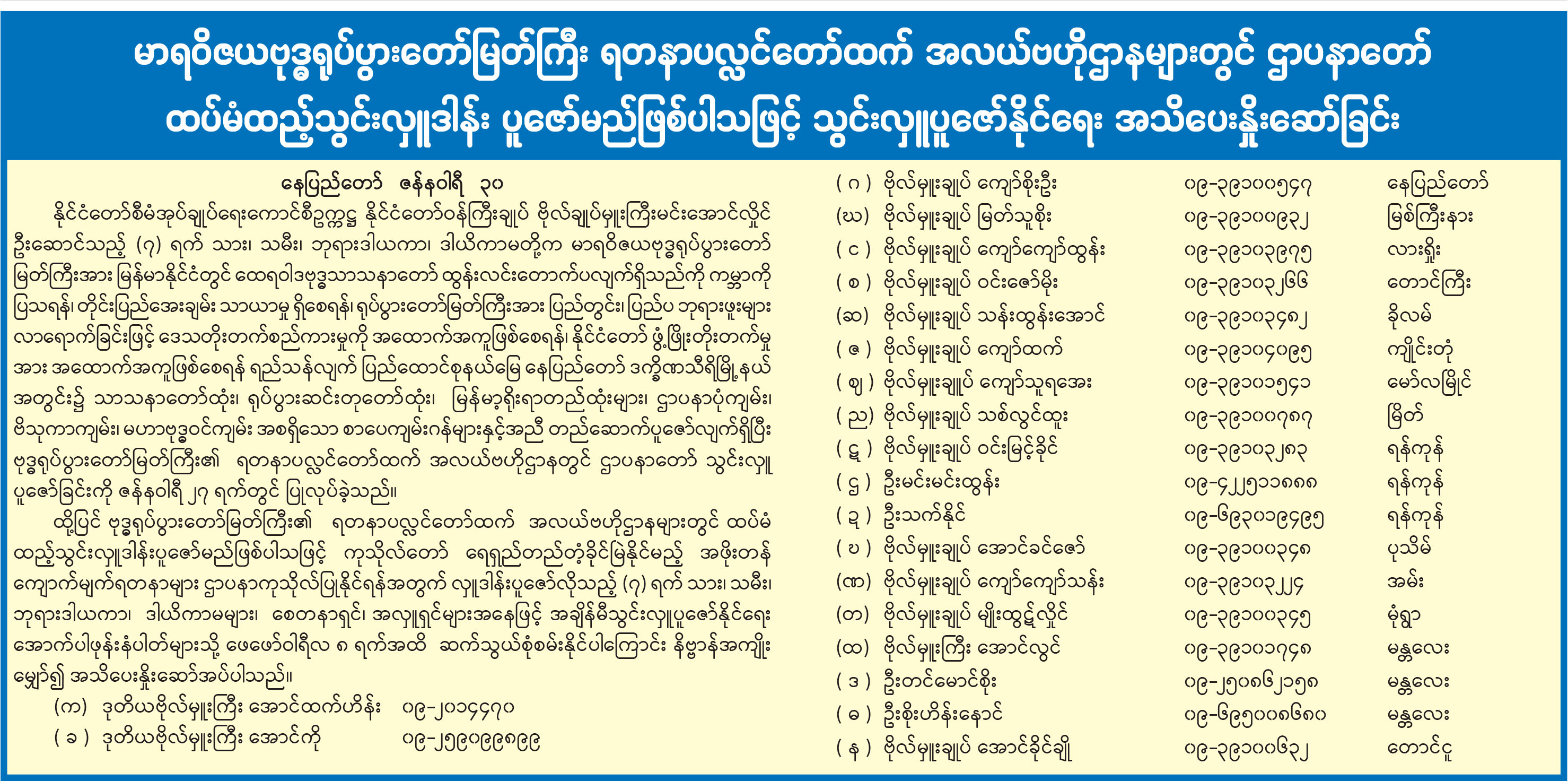မာရဝိဇယဗုဒ္ဓရုပ်ပွားတော်မြတ်ကြီး ရတနာပလ္လင်တော်ထက် အလယ်ဗဟိုဌာနများတွင် ဌာပနာတော် ထပ်မံထည့်သွင်းလှူဒါန်း ပူဇော်မည်ဖြစ်ပါသဖြင့် သွင်းလှူပူဇော်နိုင်ရေး အသိပေးနှိုးဆော်ခြင်း