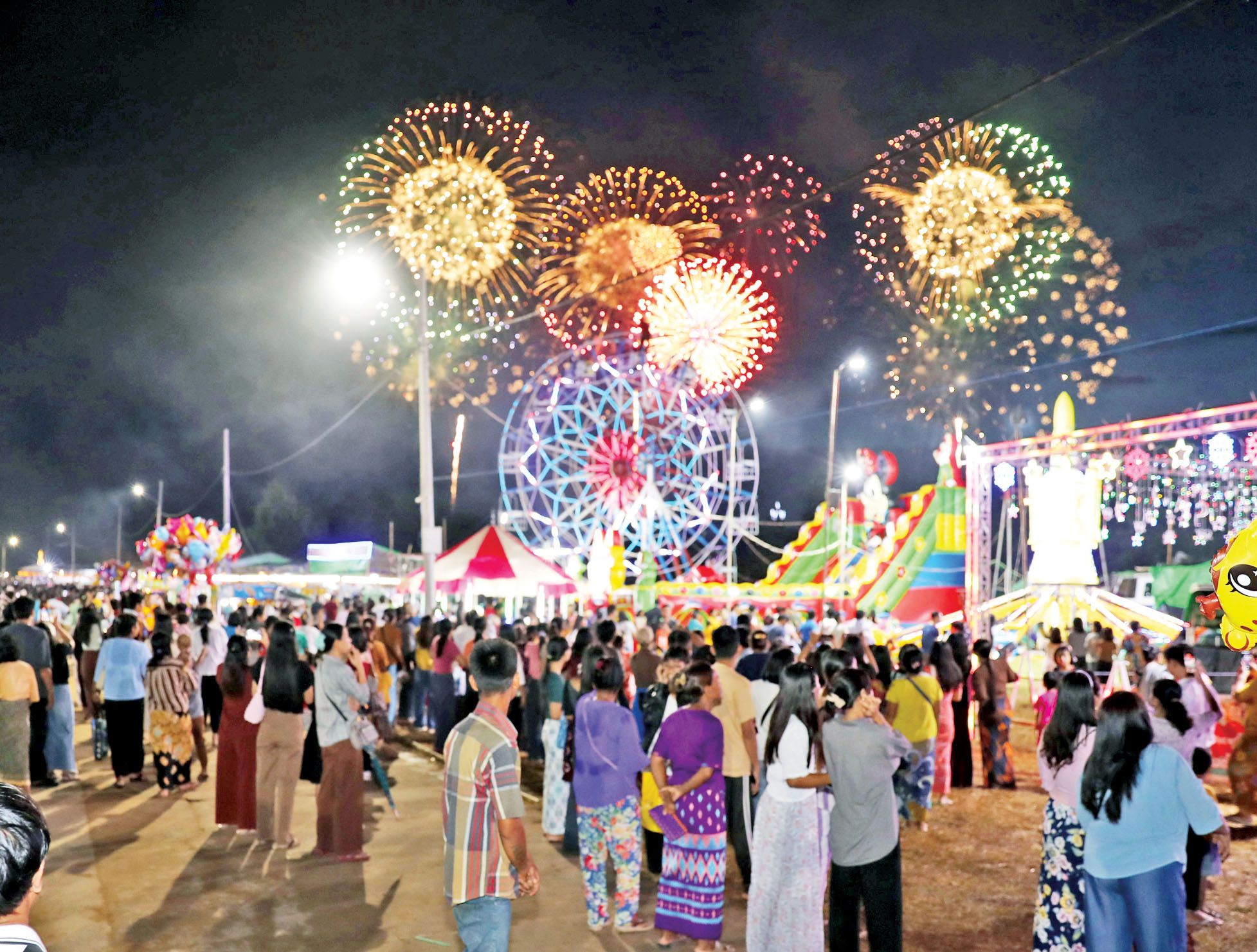ထို့နောက် မီးပုံးပျံလွှတ်တင်၍ မြတ်စွာဘုရားရှင်အား ပူဇော်မည့်အချိန်တွင် တိုင်းရင်းသားရိုးရာ အကအလှများ၊ အိုးစည်ဒိုးပတ်၊ သံချပ်တီးလုံးများဖြင့် တွဲဖက်၍ ဘုရားဝင်းအတွင်း သတ်မှတ် နေရာများအလိုက် မီးရှူး၊ မီးပန်းများ ပစ်ဖောက်ပူဇော်ခြင်းနှင့် မီးပုံးပျံအသေးများ၊ အလှညမီးကြီးနှင့် စိန်နားပန်မီးပုံးပျံကြီးများအား ကောင်းကင်ယံထက်သို့ အောင်မြင်စွာ လွှတ်တင်ပူဇော်ကြရာ ဘုရားဖူးလာပြည်သူများ၏ ကြည်နူးပီတိလက်ခုပ်သံများဖြင့် နေပြည်တော်တန်ဆောင်မုန်းလ၏ ညအလှကို ပိုမိုပေါ်လွင်စေခဲ့သည့်အပြင် တေးသံရှင်များ၏ တန်ဆောင် တိုင်ပွဲတော်ကာလကို ဖော်ကြူးရေးဖွဲ့ထားသည့် တေးသီချင်းများ သီဆိုဖျော်ဖြေမှုကြောင့်လည်း ပွဲတော်ကြီးကို ပိုမိုပြည့်စုံစေခဲ့သည်။