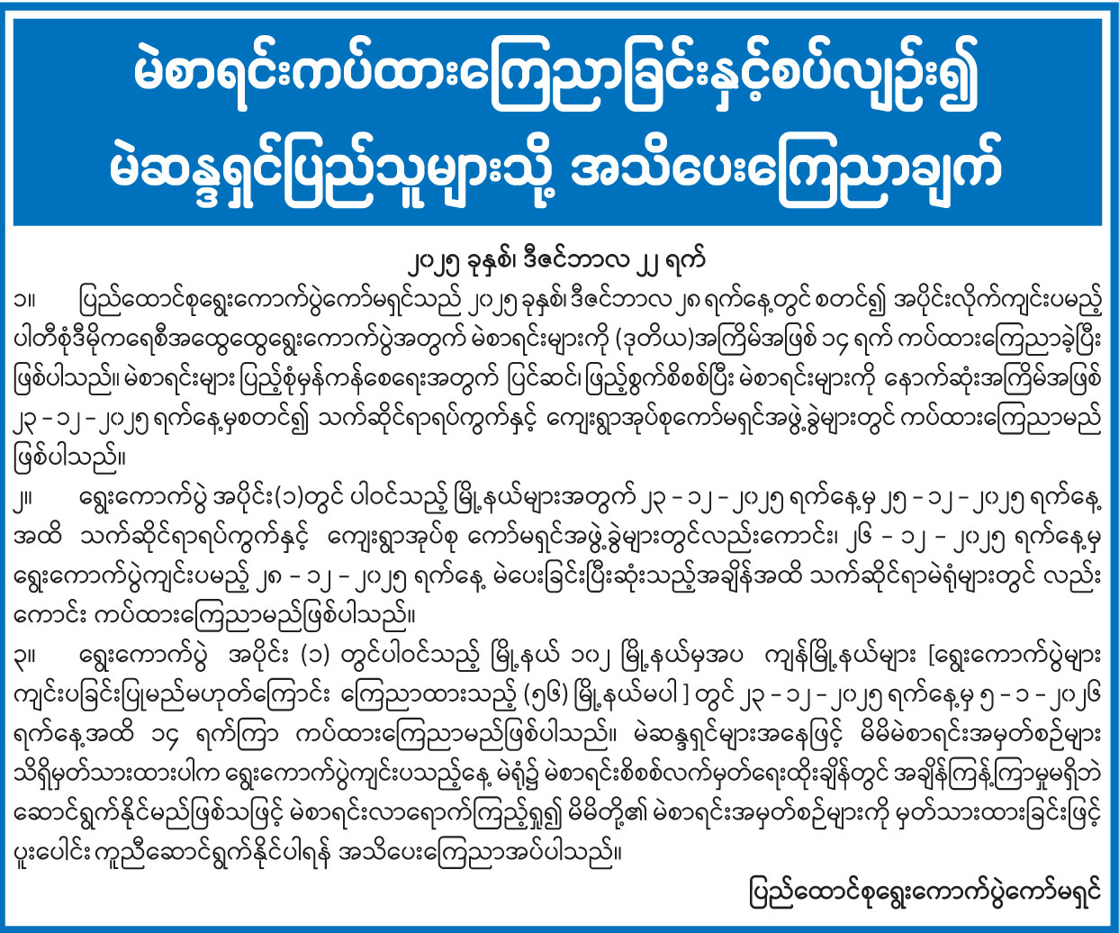 မဲစာရင်းကပ်ထားကြေညာခြင်းနှင့်စပ်လျဉ်း၍ မဲဆန္ဒရှင်ပြည်သူများသို့ အသိပေးကြေညာချက်