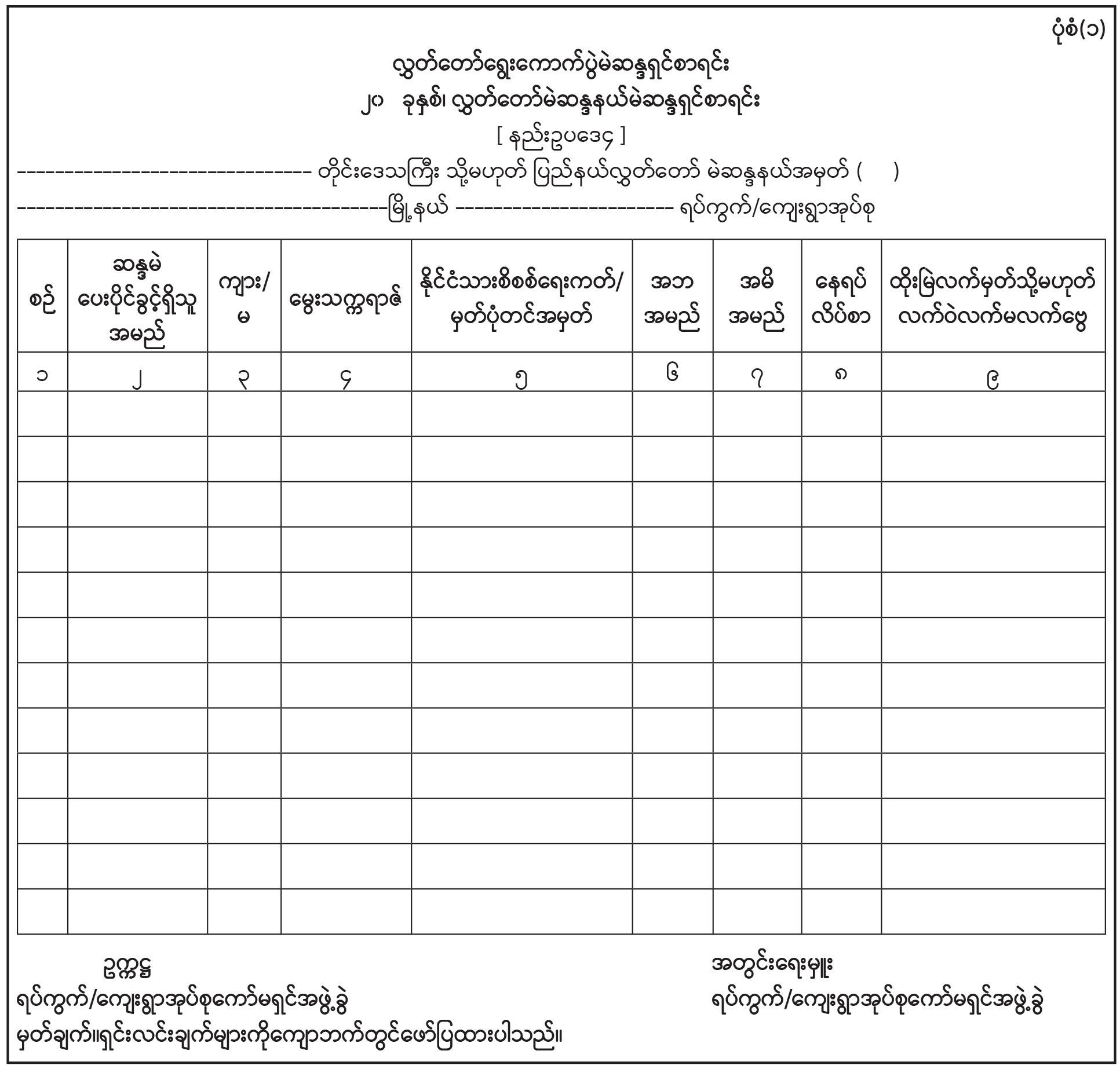 ၁၉၅၁ ခုနှစ်၊ ပြည်ထောင်စုမြန်မာနိုင်ငံအတွင်း နေထိုင်သူများ မှတ်ပုံတင်ရေးနည်းဥပဒေ ၂၅ တွင် “လူတစ်ဦးတစ်ယောက်သည် တစ်ဆက်တည်းတစ်လတည်း တစ်လထက်ပို၍ မိမိမှတ်ပုံတင်ထားသည့် လိပ်စာမှခေတ္တထွက်ခွာသွားလျှင် ထိုသူသည် မိမိမှတ်ပုံတင်ထားသည့် လိပ်စာတည်နေရာရှိ ဆိုင်ရာစာရင်းထိန်းထံဖြစ်စေ၊ မိမိရောက်နေသောနေရပ်၌ ဆိုင်ရာစာရင်းထိန်းထံမှဖြစ်စေ၊ မှတ်ပုံတင် ထားသည့်လိပ်စာမှ ထွက်ခွာကြောင်းကို အကြောင်းကြားရမည်”ဟု လည်းကောင်း၊ နည်းဥပဒေ ၂၆(၁)တွင် “မှတ်ပုံတင်ထားသူတစ်ဦး တစ်ယောက်သည် မိမိမှတ်ပုံတင်ထားသည့် လိပ်စာပြောင်းလဲသောအခါ ထိုသို့ပြောင်းလဲကြောင်းကို နည်းဥပဒေခွဲ(၂)တွင် ပြဋ္ဌာန်းထားသည့် အတိုင်း အကြောင်းကြားရမည်” ဟုလည်းကောင်း၊ နည်းဥပဒေ ၂၆(၂) တွင် “လူတစ်ဦးတစ်ယောက်သည် မိမိ၏နေရပ်သစ်သို့ ရောက်ရှိ ပြီးနောက် သုံးရက်အတွင်း ထိုသို့လိပ်စာပြောင်းလဲကြောင်းကို ထိုနေရပ်သစ်တည်ရှိသည့်နယ်ရှိ စာရင်းထိန်းထံ စာဖြင့်ရေးသား တိုင်ကြားရမည်။ ထိုသို့တိုင်ကြားသည်နှင့် တစ်ပြိုင်နက် မိမိလက်တွင်ရှိသော သက်သေခံကတ်ပြားကို သို့တည်းမဟုတ် ယာယီသက်သေခံ လက်မှတ်ကို စာရင်းထိန်းထံပေးအပ်ရမည်” ဟုလည်းကောင်း ဖော်ပြထားပါသည်။ ထို့အပြင် ပြည်ထောင်စုမြန်မာနိုင်ငံအတွင်း နေထိုင်သူများ မှတ်ပုံတင်ရေးနည်းဥပဒေ ၂၇(၁) တွင် “မှတ်ပုံတင်ထားသူ တစ်ဦးတစ်ယောက်သည် မှတ်ပုံတင်သည့် အချိန်အခါ၌ ပေးထားသော မှတ်ပုံတင်ထားသည့် လိပ်စာမှတစ်ပါး၊ အခြားအကြောင်းအရာ တစ်ခုခု နှင့်ပတ်သက်၍ ပြောင်းလဲခြင်းရှိခဲ့သော် ထိုသို့ပြောင်းလဲချက်ကို နည်းဥပဒေခွဲ (၂) တွင် ပြဋ္ဌာန်းထားသည့်အတိုင်း အကြောင်းကြားရမည်”ဟုလည်းကောင်း၊ နည်းဥပဒေ ၂၇ (၂) တွင် “လူတစ်ဦးတစ်ယောက်သည် ထိုသို့ပြောင်းလဲပြီးနောက် ရက်ပေါင်း ၃၀ အတွင်း ပြောင်းလဲချက်ကို ဆိုင်ရာစာရင်းထိန်းထံ စာဖြင့်ရေးသားတိုင်ကြားရမည်။ ထိုသို့တိုင်ကြားသည်နှင့် တစ်ပြိုင်နက် မိမိလက်တွင်ရှိသော သက်သေခံကတ်ပြားကို သို့တည်းမဟုတ် ယာယီသက်သေခံလက်မှတ်ကိုဆိုင်ရာ စာရင်းထိန်းထံပေးအပ်ရမည်”ဟုလည်းကောင်း ဖော်ပြထားပါသည်။ အိမ်ထောင်စုလူဦးရေစာရင်း ပုံစံ(၆၆/ ၆)ကို ၁၉၄၉ ခုနှစ်၊ ပြည်ထောင်စု မြန်မာနိုင်ငံအတွင်း နေထိုင်သူများ မှတ်ပုံတင်ရေးအက်ဥပဒေအရ ထုတ်ပေးခြင်းဖြစ်ရာ နိုင်ငံအတွင်းနေထိုင်သူများသည် နေထိုင်သည့် နေရပ်လိပ်စာပြောင်းသွားပါက ဖော်ပြပါမှတ်ပုံတင်ရေးနည်းဥပဒေ ၂၇ (၁)နှင့် (၂) ပါအတိုင်း သတင်းပို့အကြောင်းကြားရမည် ဖြစ်ပါသည်။ သို့မှသာ ပြောင်းရွှေ့ရောက်ရှိသော မြို့နယ်၏ မဲစာရင်းတွင်ပါဝင်မည် ဖြစ်သည်။