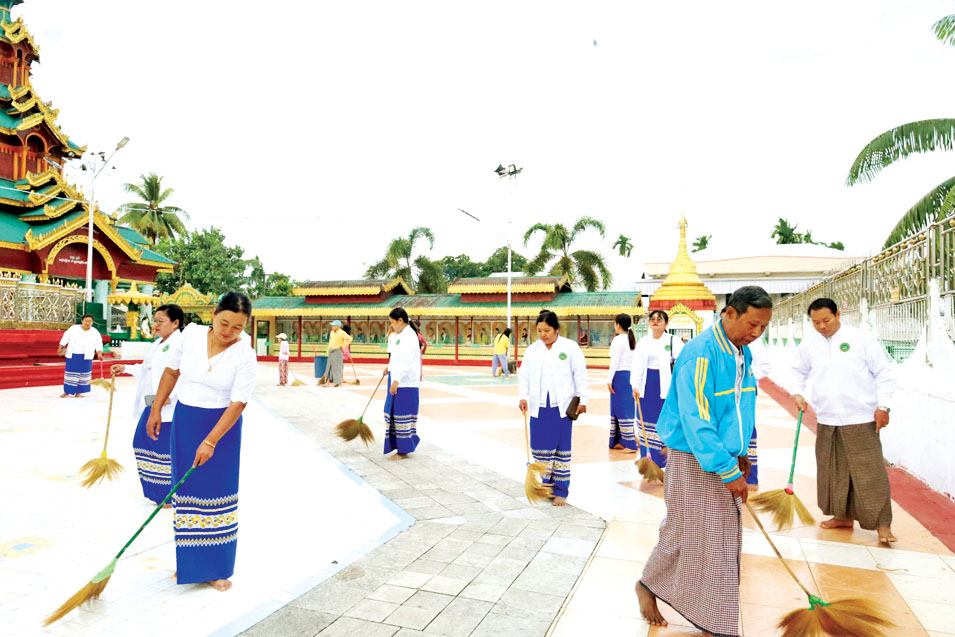 အဆိုပါ စုပေါင်းသန့်ရှင်းရေးဆောင်ရွက်ခြင်းကို မြို့နယ်ဦးစီးအရာရှိ ဦးသန့်စင်၏ ကြီးကြပ်မှုဖြင့် မြို့နယ်သမဝါယမဦးစီးဌာနနှင့် မြို့နယ်သမဝါယမအသင်းစုတို့က ဦးဆောင်၍ သမဝါယမမိသားစုများက ပန်း၊ ဆီမီး၊ ရေချမ်းများကပ်လှူပူဇော်ခြင်း၊ ဘုရားရင်ပြင်တော် အတွင်း၊ အပြင် တံမြက်စည်းလှည်းခြင်းနှင့် ဘုရားဝင်းပြင်ပ၌ အမှိုက်ကောက်ယူခြင်းများ ဆောင်ရွက်ခဲ့ကြကြောင်း သိရသည်။