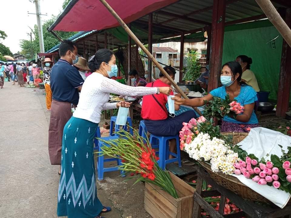 အဆိုပါ နှာခေါင်းစည်း Mask များဖြန့်ဝေရာတွင် ခရိုင်/မြို့နယ် စီမံအုပ်ချုပ်ရေးအဖွဲ့၏ ဦးဆောင်မှုဖြင့် ဌာနဆိုင်ရာအကြီးအကဲများ၊ မြို့နယ်အထွေထွေအုပ်ချုပ်ရေးဦးစီးဌာန ဝန်ထမ်းများ၊ ပြန်ကြားရေးနှင့် ပြည်သူ့ဆက်ဆံရေး ဦးစီးဌာနဝန်ထမ်းများ၊ စည်ပင်သာယာရေးအဖွဲ့ဝန်ထမ်းများ၊ နယ်မြေခံတပ်ရင်း ၂၇ မှ အရာရှိနှင့် တပ်ဖွဲ့ဝင်များ ပူးပေါင်းပြီး လူစည်ကားရာ အခွန်လွတ်စျေး၊ တေဇလမ်းနှင့် ဘုရားလမ်းဆုံနေရာ၊ ပြုံးချိုလေး စျေးနေရာများရှိ လမ်းမကြီးပေါ်သွားလာနေသော ပြည်သူများကို နှာခေါင်းစည်း Mask များ အခမဲ့ဖြန့်ဝေပေးခဲ့ကြောင်း သိရသည်။