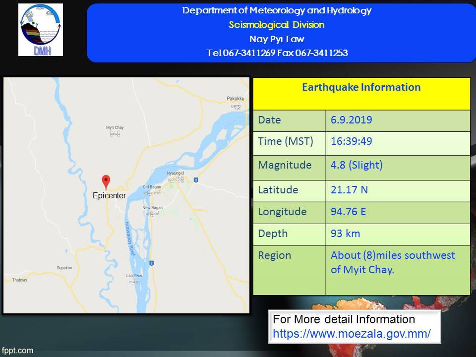 အဆိုပါ မြေငလျင်သည် မြောက်လတ္တီတွဒ် (၂၁.၁၇)ဒီဂရီ၊ အရှေ့လောင်ဂျီတွဒ် (၉၄.၇၆)ဒီဂရီ၊ အနက်(၉၃)ကီလိုမီတာကိုဗဟိုပြု၍ လှုပ်ရှားသွားကြောင်း သိရသည်။