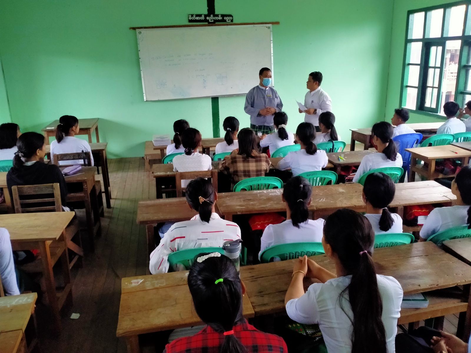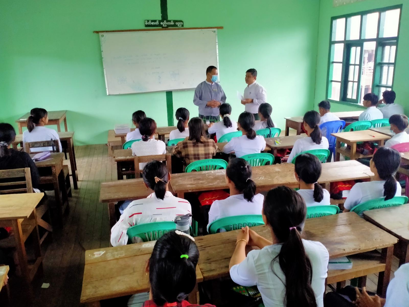 ရှေးဦးစွာ ကချင်ပြည်နယ်ပညာရေးမှူး ဦးကြည်စိန်နှင့် တာဝန်ရှိသူများက မြစ်ကြီးနားမြို့ ရွှေစက်ရပ်ကွက်ရှိ အခြေခံပညာအထက်တန်းကျောင်း(ရွှေစက်)သို့ ရောက်ရှိကာ ကျောင်းအုပ်ကြီးနှင့် ဆရာ ဆရာမများအား တွေ့ဆုံ၍ ကျောင်းတွင်းလိုအပ်ချက်များအား မေးမြန်ပြီး ကျောင်းသား ကျောင်းသူများ ပညာသင်ကြားရာတွင် တွေ့ကြုံနိုင်သည့် အခက်အခဲများအား ကြည့်ရှု၍ လိုအပ်သည် များ မဖြစ်စေရေး ကြိုးစားဆောင်ရွက်ရန် ပြောကြားခဲ့သည်။
