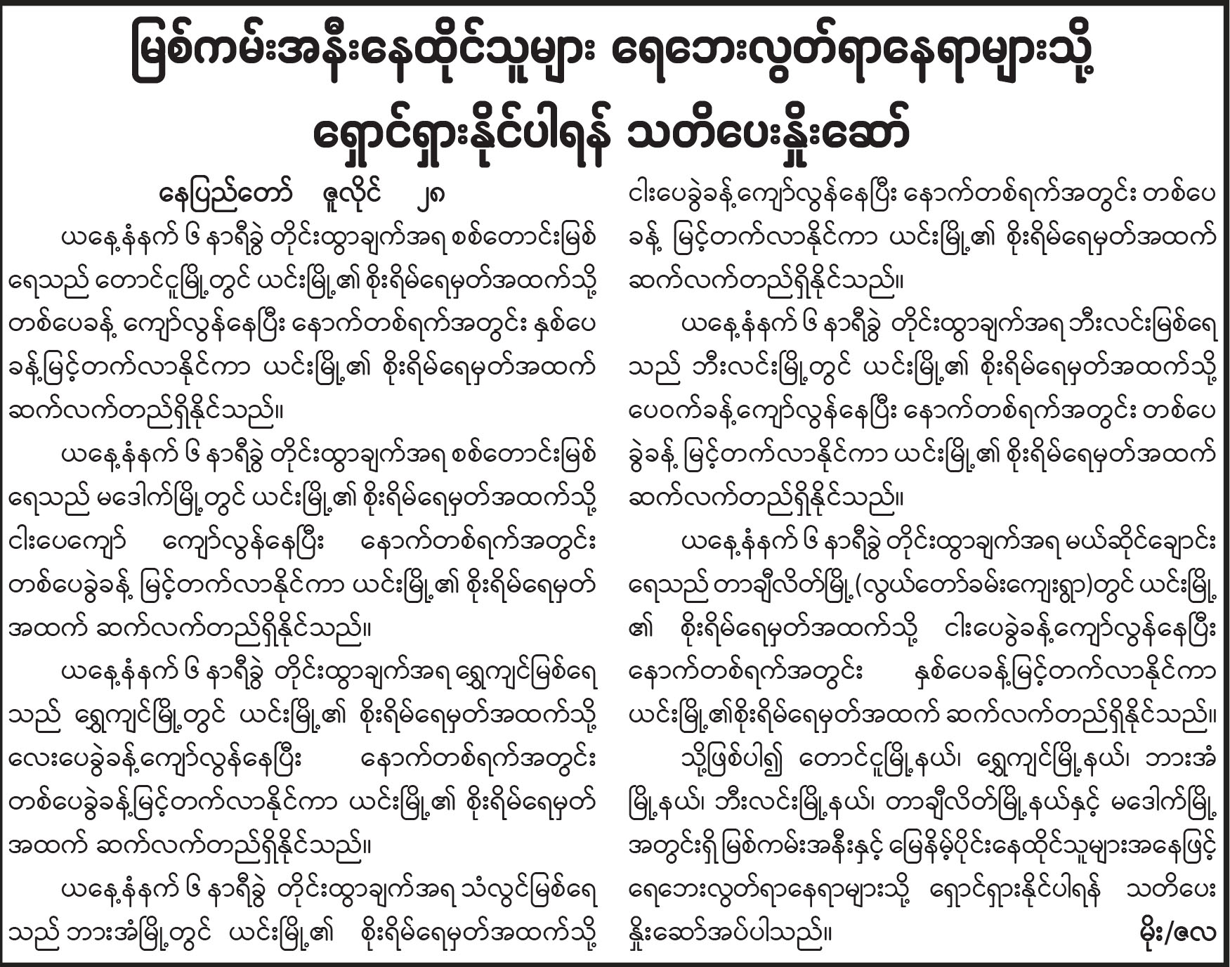မြစ်ကမ်းအနီးနေထိုင်သူများ ရေဘေးလွတ်ရာနေရာများသို့ ရှောင်ရှားနိုင်ပါရန် သတိပေးနှိုးဆော်