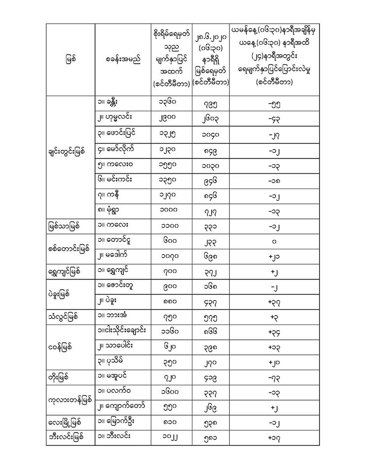 မိုးလေဝသနှင့် ဇလဗေဒညွှန်ကြားမှုဦးစီးဌာနမှ (၂၈.၆.၂၀၂၀) ရက်နေ့ နံနက်(ဝ၆:၃၀)နာရီအချိန်တွင် တိုင်းတာရရှိသော မြစ်ရေအခြေအနေများကို သိရှိနိုင်ပါရန် ဖော်ပြလိုက်ပါတယ်။