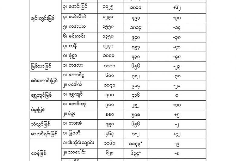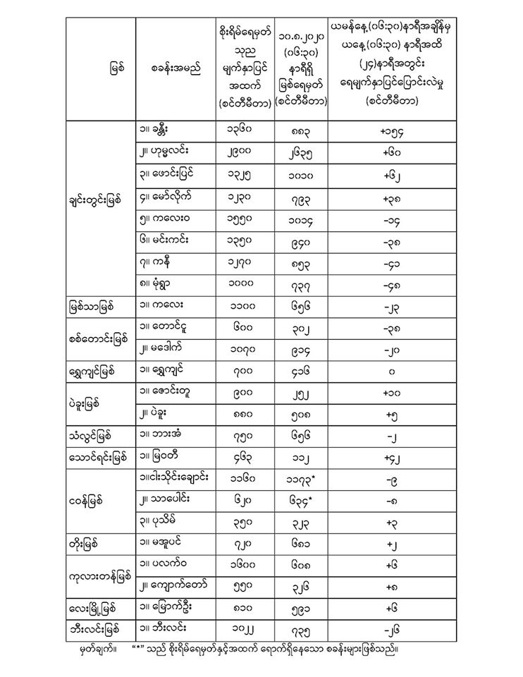 Aug 10,2020 |10:29 | နေပြည်တော် ၁၀ ဩဂုတ် မိုးလေဝသနှင့် ဇလဗေဒညွှန်ကြားမှုဦးစီးဌာနမှ (၁၀.၈.၂၀၂၀) ရက်နေ့ နံနက်(၀၆:၃၀)နာရီအချိန်တွင် တိုင်းတာရရှိသော မြစ်ရေအခြေအနေများကို သိရှိနိုင်ပါရန် ဖော်ပြလိုက်ပါတယ်။ Crd-မိုးလေဝသနှင့်ဇလဗေဒညွှန်ကြားမှုဦးစီးဌာန