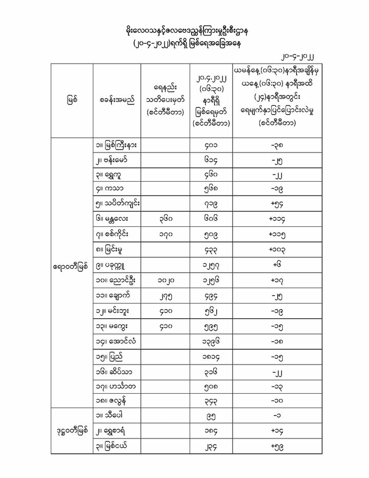 Apr 20,2022 |11:10 | ဧပြီ ၂၀ မိုးလေဝသနှင့် ဇလဗေဒညွှန်ကြားမှုဦးစီးဌာနမှ (၂၀.၄.၂၀၂၂) ရက်နေ့ နံနက် ၆ နာရီခွဲတွင် တိုင်းတာ ရရှိသော မြစ်ရေအခြေအနေများကို သိရှိနိုင်ပါရန် ဖော်ပြလိုက်ပါတယ်... Crd>>>မိုး/ဇလ