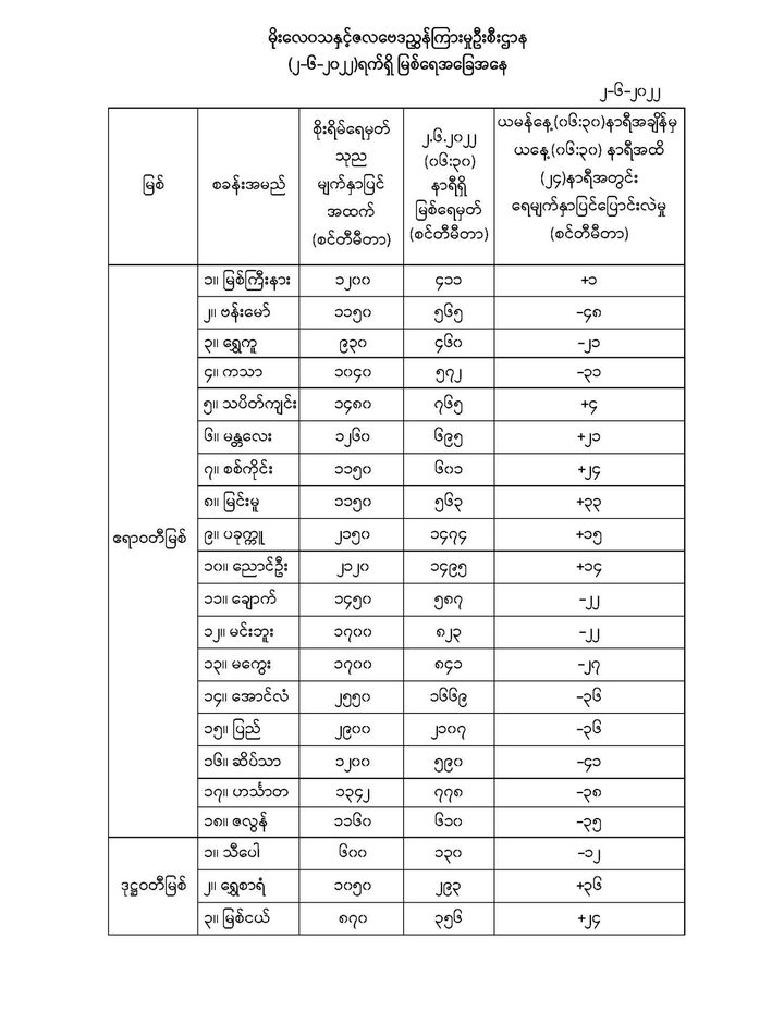 Jun 2,2022 |10:12 | ဇွန် ၂ မိုးလေဝသနှင့် ဇလဗေဒညွှန်ကြားမှုဦးစီးဌာနမှ (၂.၆.၂၀၂၂) ရက်နေ့ နံနက်(၀၆:၃၀)နာရီအချိန်တွင် တိုင်းတာရရှိသော မြစ်ရေအခြေအနေများကို သိရှိနိုင်ပါရန် ဖော်ပြလိုက်ပါတယ်... Crd>>>မိုး/ဇလ