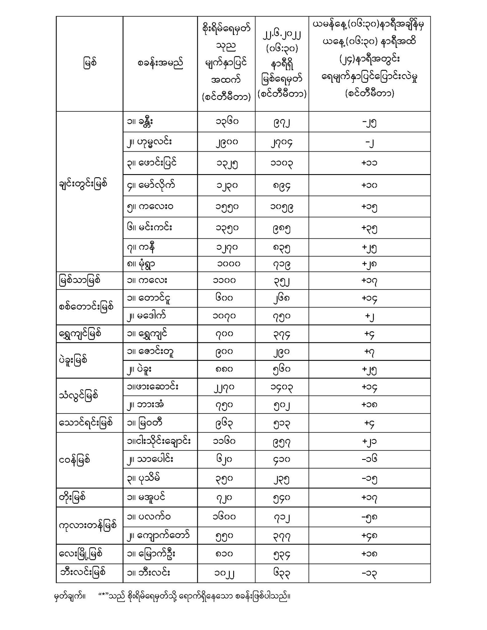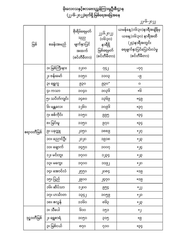 Jun 22,2022 |09:59 | ဇွန် ၂၂ မိုးလေဝသနှင့် ဇလဗေဒညွှန်ကြားမှုဦးစီးဌာနမှ (၂၂.၆.၂၀၂၂) ရက်နေ့ နံနက်(၀၆:၃၀)နာရီအချိန်တွင် တိုင်းတာရရှိသော မြစ်ရေအခြေအနေများကို သိရှိနိုင်ပါရန် ဖော်ပြလိုက်ပါတယ်... Crd>>>မိုး/ဇလ