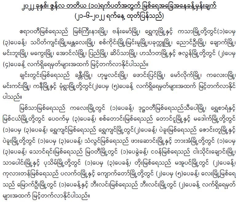 မိုးလေဝသနှင့် ဇလဗေဒညွှန်ကြားမှုဦးစီးဌာနမှ ၂၀၂၂ ခုနှစ်၊ ဇွန်လ တတိယ(၁၀)ရက်ပတ်အတွက် မြစ်ရေအခြေအနေခန့်မှန်းချက်ကို (၂၁.၆.၂၀၂၂) ရက်နေ့တွင် အောက်ပါအတိုင်း ထုတ်ပြန် ထားပါတယ်…