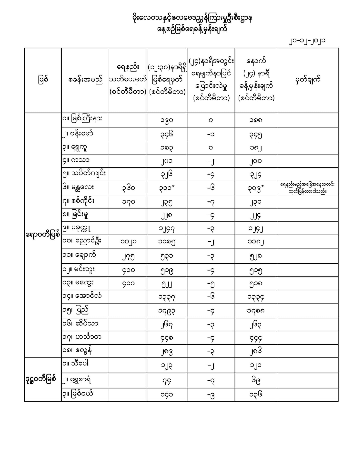 မိုးလေဝသနှင့် ဇလဗေဒညွှန်ကြားမှုဦးစီးဌာနမှ (၂၀.၁၂.၂၀၂၁) ရက်နေ့တွင် ထုတ်ပြန်သည့် နေ့စဉ်မြစ်ရေခန့်မှန်းချက်များကို အောက်ပါအတိုင်း ဖော်ပြထားပါတယ်...