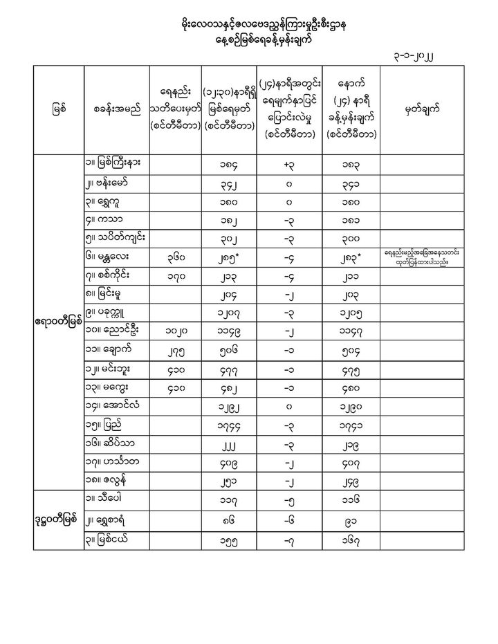 Jan 3,2022 |01:34 | ဇန်နဝါရီ ၃ မိုးလေဝသနှင့် ဇလဗေဒညွှန်ကြားမှုဦးစီးဌာနမှ (၃.၁.၂၀၂၂) ရက်နေ့တွင် ထုတ်ပြန်သည့် နေ့စဉ်မြစ်ရေခန့်မှန်းချက်များကို အောက်ပါအတိုင်း ဖော်ပြထားပါတယ်... Crd>>>မိုး/ဇလ