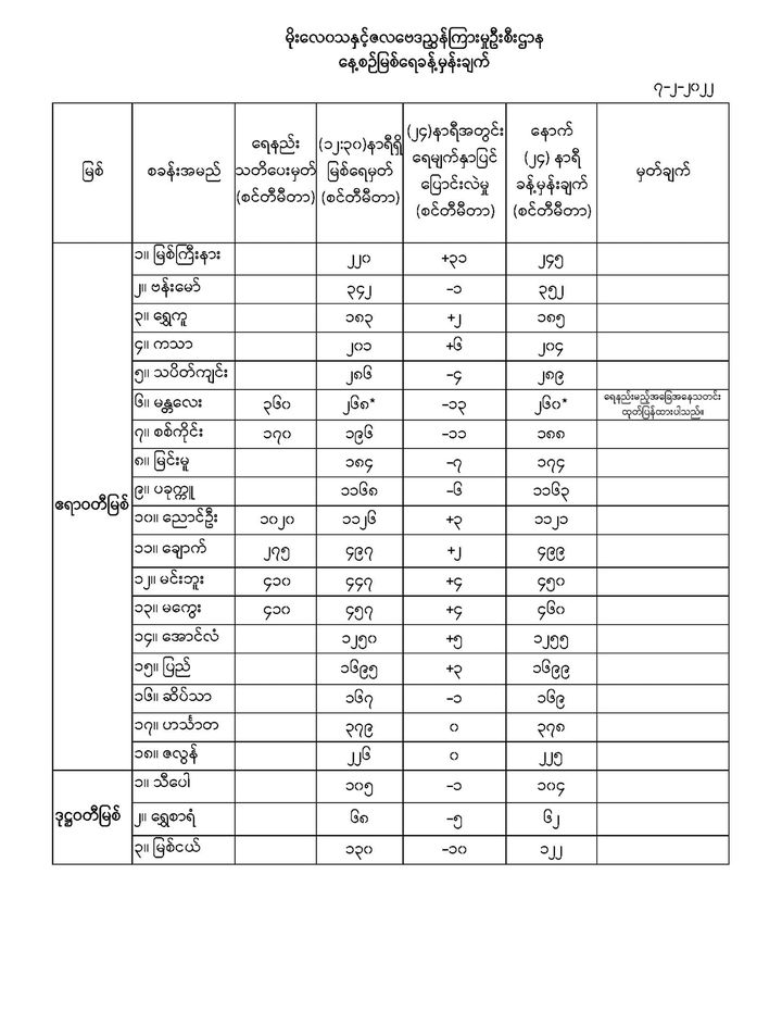 Feb 7,2022 |03:10 | ဖေဖော်ဝါရီ ၇ မိုးလေဝသနှင့် ဇလဗေဒညွှန်ကြားမှုဦးစီးဌာနမှ (၇.၂.၂၀၂၂) ရက်နေ့တွင် ထုတ်ပြန်သည့် နေ့စဉ်မြစ်ရေခန့်မှန်းချက်များကို အောက်ပါအတိုင်း ဖော်ပြထားပါတယ်... Crd>>>မိုး/ဇလ