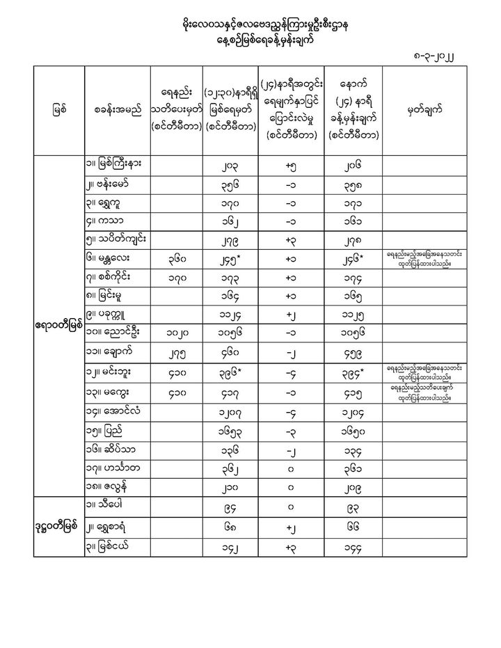 Mar 8,2022 |02:08 | မတ် ၈ မိုးလေဝသနှင့် ဇလဗေဒညွှန်ကြားမှုဦးစီးဌာနမှ (၈.၃.၂၀၂၂) ရက်နေ့တွင် ထုတ်ပြန်သည့် နေ့စဉ်မြစ်ရေခန့်မှန်းချက်များကို အောက်ပါအတိုင်း ဖော်ပြထားပါတယ်... Crd>>>မိုး/ဇလ