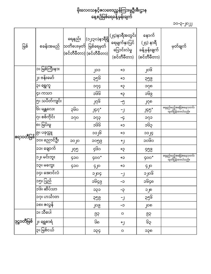 မိုးလေဝသနှင့် ဇလဗေဒညွှန်ကြားမှုဦးစီးဌာနမှ (၁၀.၃.၂၀၂၂) ရက်နေ့တွင် ထုတ်ပြန်သည့် နေ့စဉ်မြစ်ရေခန့်မှန်းချက်များကို အောက်ပါအတိုင်း ဖော်ပြထားပါတယ်...