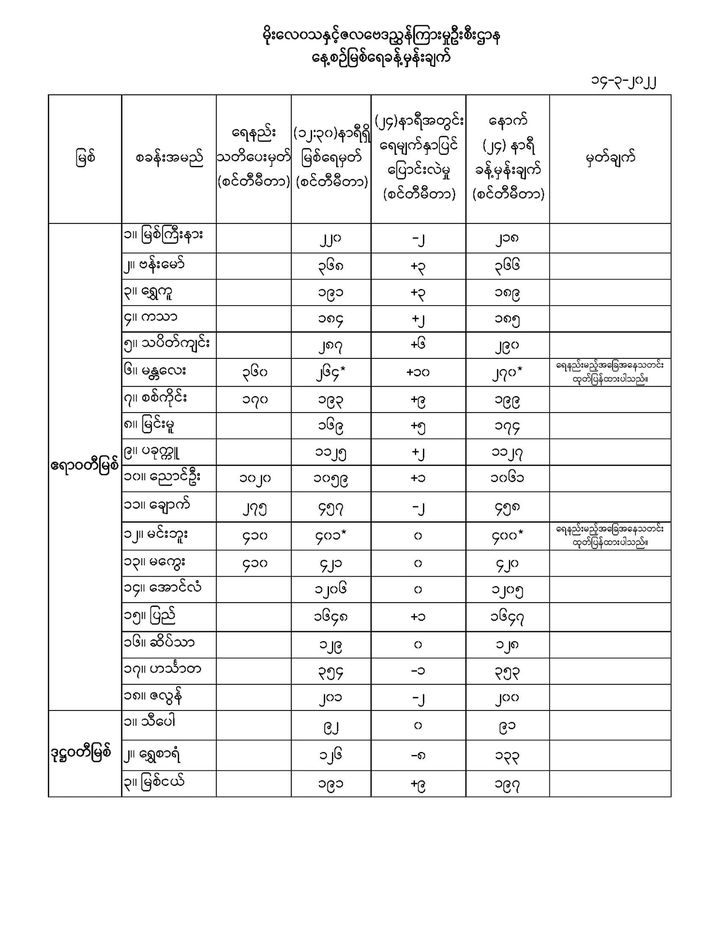 Mar 14,2022 |01:23 | မတ် ၁၄ မိုးလေဝသနှင့် ဇလဗေဒညွှန်ကြားမှုဦးစီးဌာနမှ (၁၄.၃.၂၀၂၂) ရက်နေ့တွင် ထုတ်ပြန်သည့် နေ့စဉ်မြစ်ရေခန့်မှန်းချက်များကို အောက်ပါအတိုင်း ဖော်ပြထားပါတယ်... Crd>>>မိုး/ဇလ