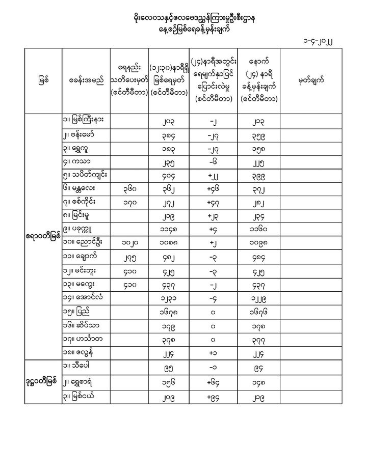 Apr 1,2022 |02:10 | ဧပြီ ၁ မိုးလေဝသနှင့် ဇလဗေဒညွှန်ကြားမှုဦးစီးဌာနမှ (၁.၄.၂၀၂၂) ရက်နေ့တွင် ထုတ်ပြန်သည့် နေ့စဉ်မြစ်ရေခန့်မှန်းချက်များကို အောက်ပါအတိုင်း ဖော်ပြထားပါတယ်... Crd>>>မိုး/ဇလ