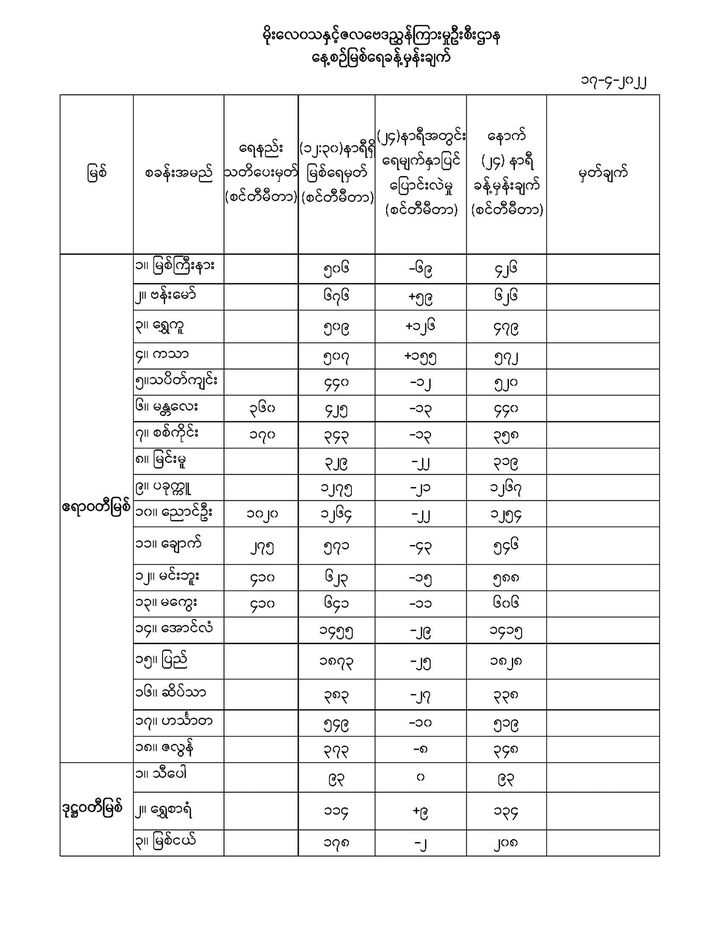 မိုးလေဝသနှင့် ဇလဗေဒညွှန်ကြားမှုဦးစီးဌာနမှ (၁၇.၄.၂၀၂၂) ရက်နေ့တွင် ထုတ်ပြန်သည့် နေ့စဉ်မြစ်ရေခန့်မှန်းချက်များကို အောက်ပါအတိုင်း ဖော်ပြထားပါတယ်...