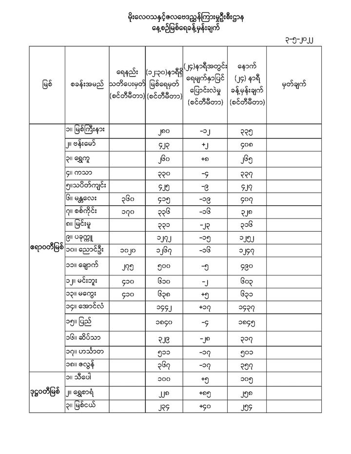 May 3,2022 |03:23 | မေ ၃ မိုးလေဝသနှင့် ဇလဗေဒညွှန်ကြားမှုဦးစီးဌာနမှ (၃.၅.၂၀၂၂) ရက်နေ့တွင် ထုတ်ပြန်သည့် နေ့စဉ်မြစ်ရေခန့်မှန်းချက်များကို အောက်ပါအတိုင်း ဖော်ပြထားပါတယ်... Crd>>>မိုး/ဇလ