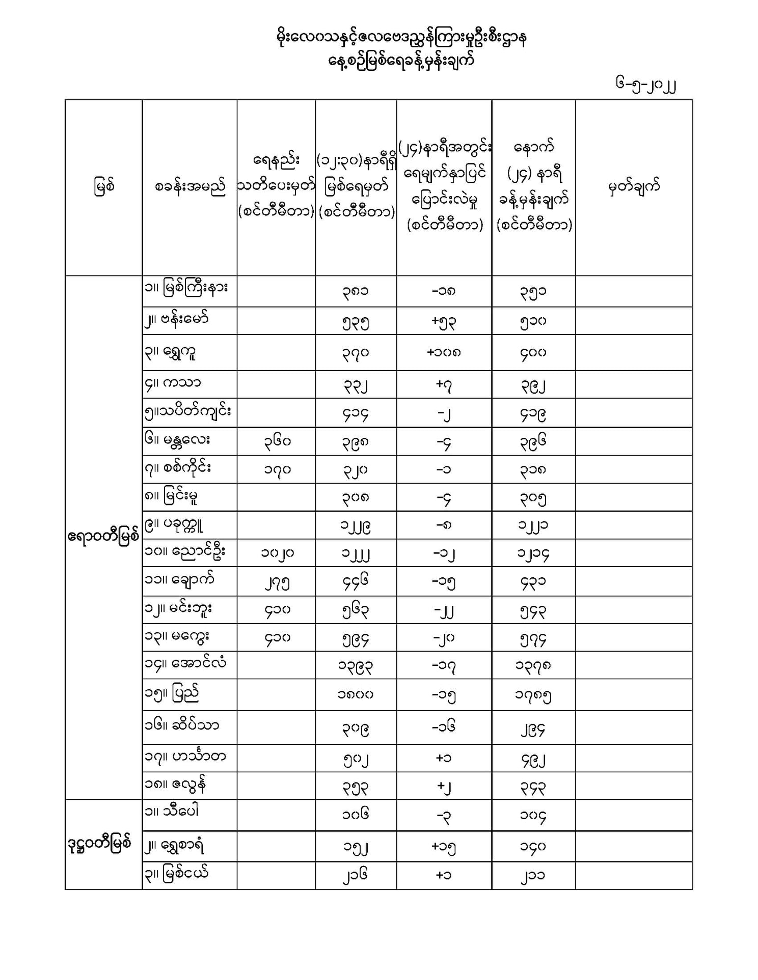 မိုးလေဝသနှင့် ဇလဗေဒညွှန်ကြားမှုဦးစီးဌာနမှ (၆.၅.၂၀၂၂) ရက်နေ့တွင် ထုတ်ပြန်သည့် နေ့စဉ်မြစ်ရေခန့်မှန်းချက်များကို အောက်ပါအတိုင်း ဖော်ပြထားပါတယ်...