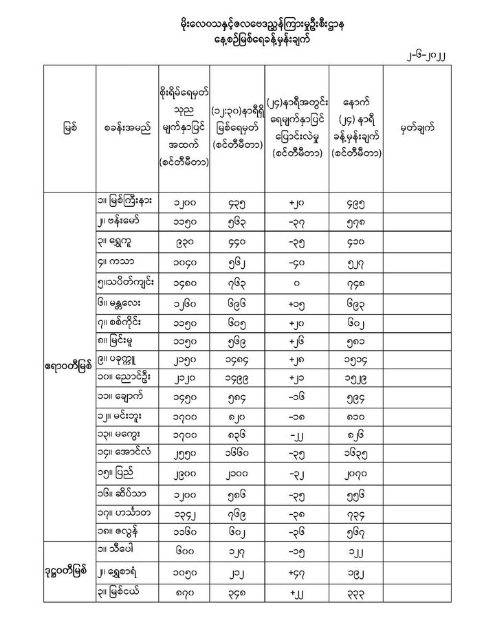 Jun 2,2022 |03:03 | ဇွန် ၂ မိုးလေဝသနှင့် ဇလဗေဒညွှန်ကြားမှုဦးစီးဌာနမှ (၂.၆.၂၀၂၂) ရက်နေ့တွင် ထုတ်ပြန်သည့် နေ့စဉ်မြစ်ရေခန့်မှန်းချက်များကို အောက်ပါအတိုင်း ဖော်ပြထားပါတယ်... Crd>>>မိုး/ဇလ