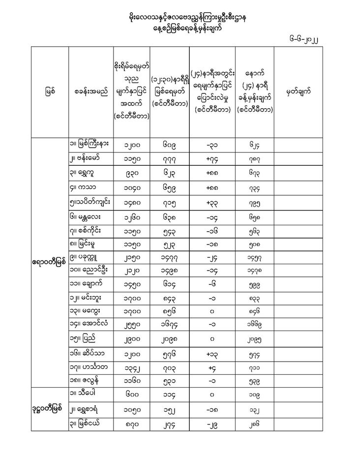 Jun 6,2022 |02:30 | ဇွန် ၆ မိုးလေဝသနှင့် ဇလဗေဒညွှန်ကြားမှုဦးစီးဌာနမှ (၆.၆.၂၀၂၂) ရက်နေ့တွင် ထုတ်ပြန်သည့် နေ့စဉ်မြစ်ရေခန့်မှန်းချက်များကို အောက်ပါအတိုင်း ဖော်ပြထားပါတယ်... Crd>>>မိုး/ဇလ