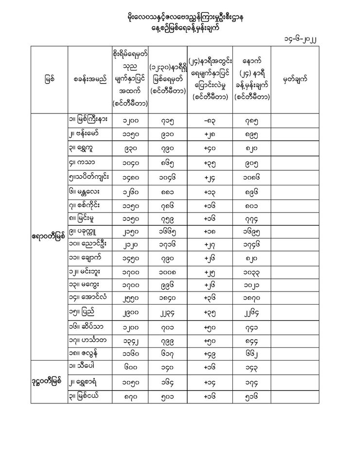 Jun 14,2022 |02:19 | ဇွန် ၁၄ မိုးလေဝသနှင့် ဇလဗေဒညွှန်ကြားမှုဦးစီးဌာနမှ (၁၄.၆.၂၀၂၂) ရက်နေ့တွင် ထုတ်ပြန်သည့် နေ့စဉ်မြစ်ရေခန့်မှန်းချက်များကို အောက်ပါအတိုင်း ဖော်ပြထားပါတယ်... Crd>>>မိုး/ဇလ