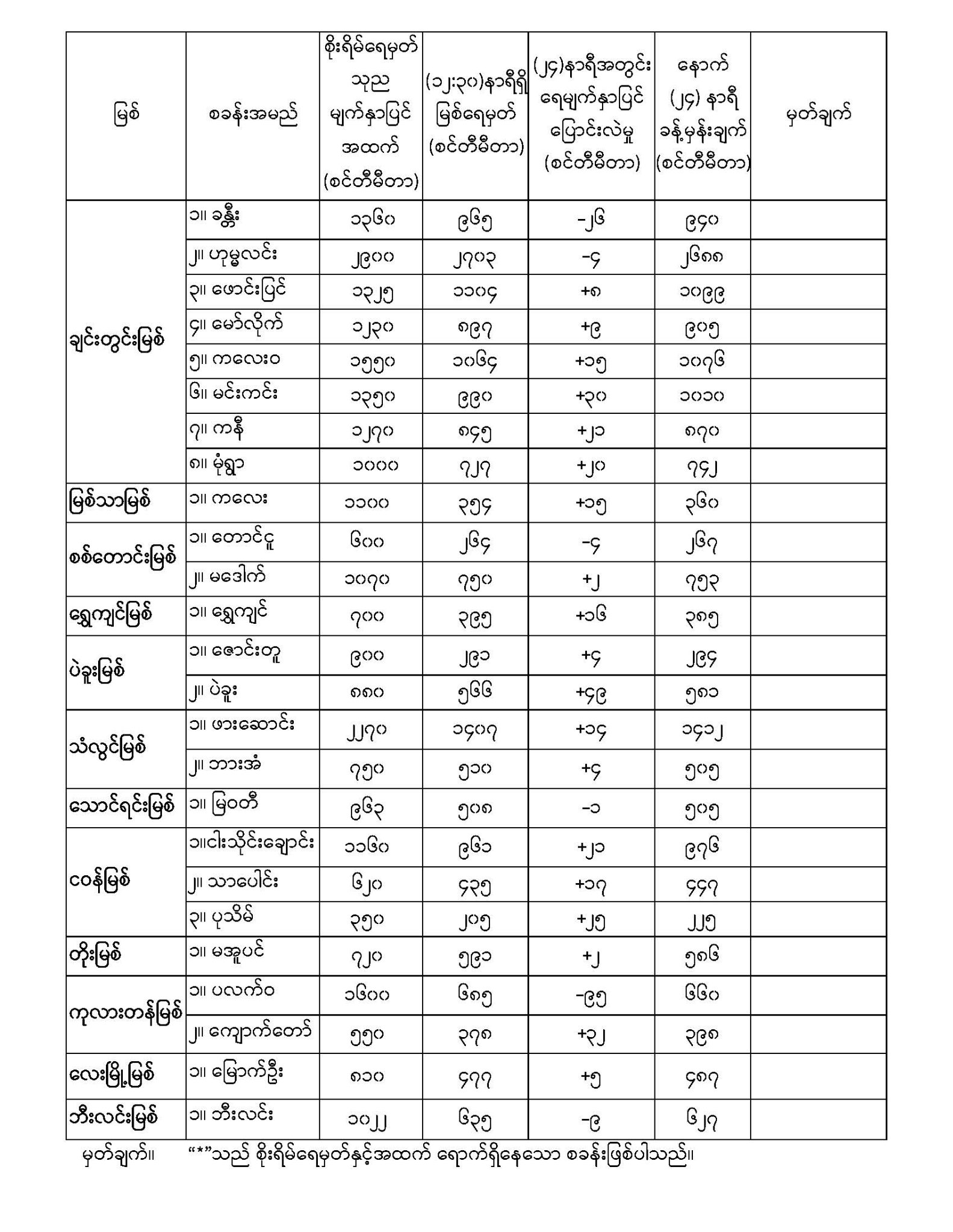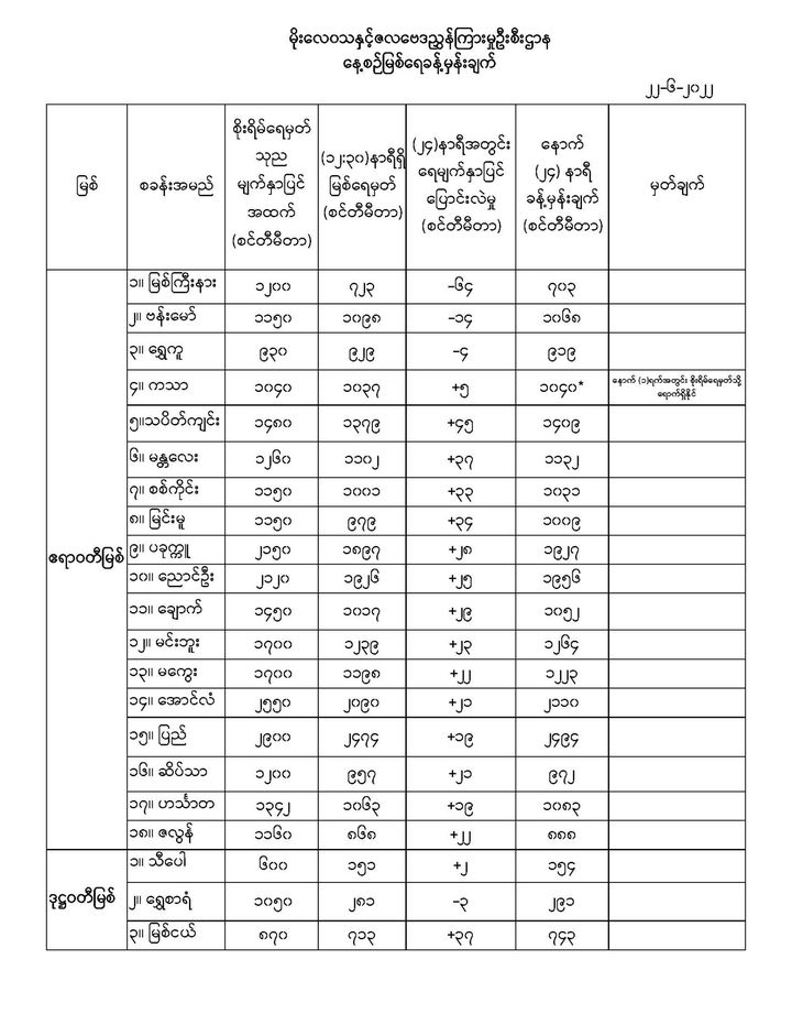 Jun 22,2022 |02:18 | ဇွန် ၂၂ မိုးလေဝသနှင့် ဇလဗေဒညွှန်ကြားမှုဦးစီးဌာနမှ (၂၂.၆.၂၀၂၂) ရက်နေ့တွင် ထုတ်ပြန်သည့် နေ့စဉ်မြစ်ရေခန့်မှန်းချက်များကို အောက်ပါအတိုင်း ဖော်ပြထားပါတယ်... Crd>>>မိုး/ဇလ